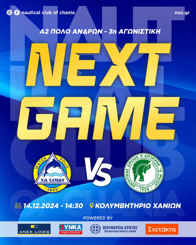 Η ανδρική ομάδα πόλο του ΝΟ Χανίων ετοιμάζεται να δώσει το δεύτερο εντός έδρας παιχνίδι της. Αντίπαλός της ο Μίλωνας τον οποίο θα υποδεχθεί το Σάββατο (14/12) στις 14:30 για την 3η αγωνιστική της Α2.