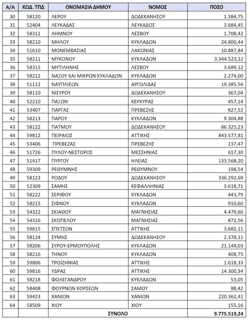 Είναι χαρακτηριστικό ότι από τα 9.775.519,24€ τα οποία αποτελούν το ποσό της επιχορήγησης που πρόκειται να δοθεί στους Δήμους ολόκληρης της ελληνικής επικράτειας, η Μύκονος και η Σαντορίνη θα εισπράξουν 6.694.071,81€.