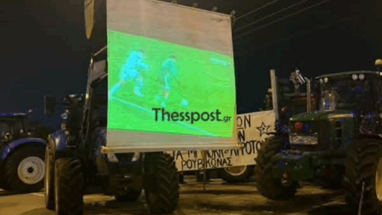 Όπως φαίνεται στο βίντεο και στις φωτογραφίες του ΤhessPost.gr, έχουν τοποθετήσει οθόνη προβολής σε τρακτέρ, συντονισμένη στο κανάλι του αγώνα.