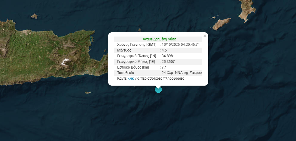 Σεισμός 4,5 βαθμών της κλίμακας ρίχτερ, έγινε αισθητός νωρίτερα το πρωί της Πέμπτης 15/10 στο Λασίθι.