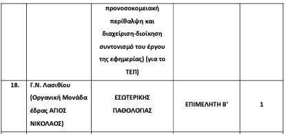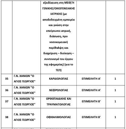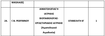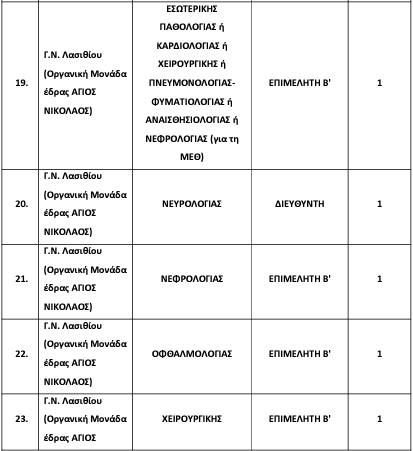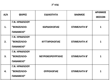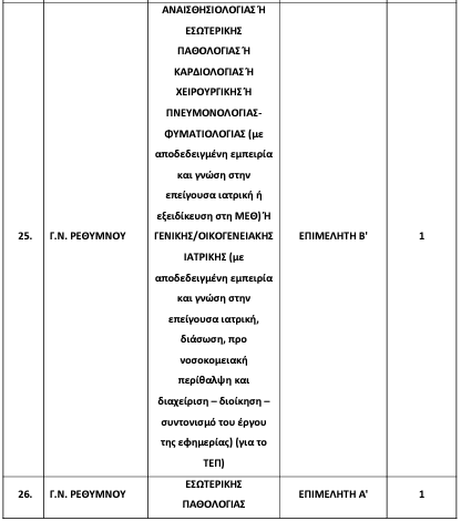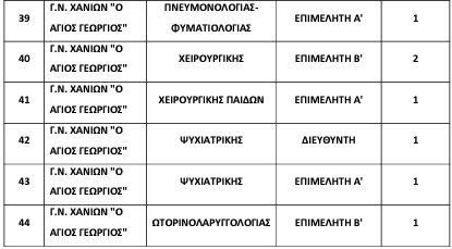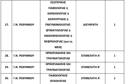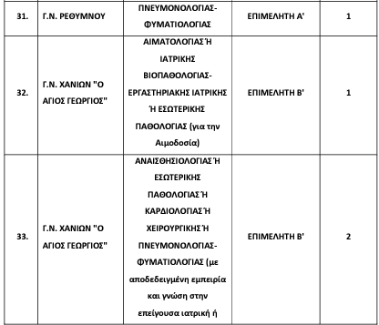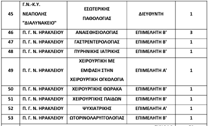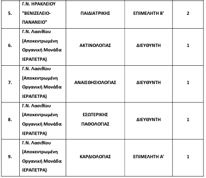 58 θέσεις αφορούν σε νοσοκομεία της Κρήτης και συγκεκριμένα 6 θέσεις στο Βενιζέλειο Νοσοκομείο Ηρακλείου, 5 θέσεις στο Νοσοκομείο Ιεράπετρας, 5 θέσεις στο Νοσοκομείο Σητείας, 9 θέσεις στο Νοσοκομείο Αγίου Νικολάου, 8 θέσεις στο Νοσοκομείο Ρεθύμνου, 14 θέσεις στο Νοσοκομείο Χανίων, 1 θέση στο Νοσοκομείο Νεάπολης και 10 θέσεις στο ΠΑΓΝΗ.