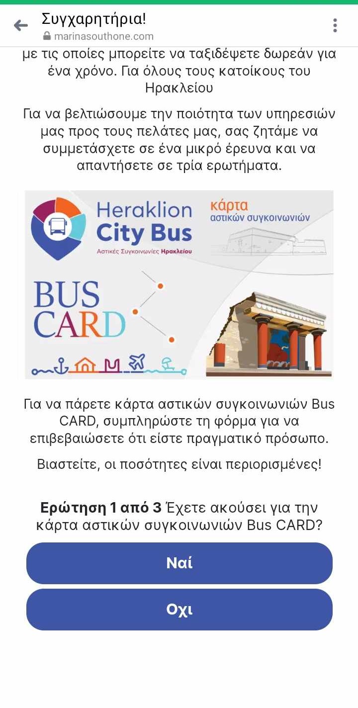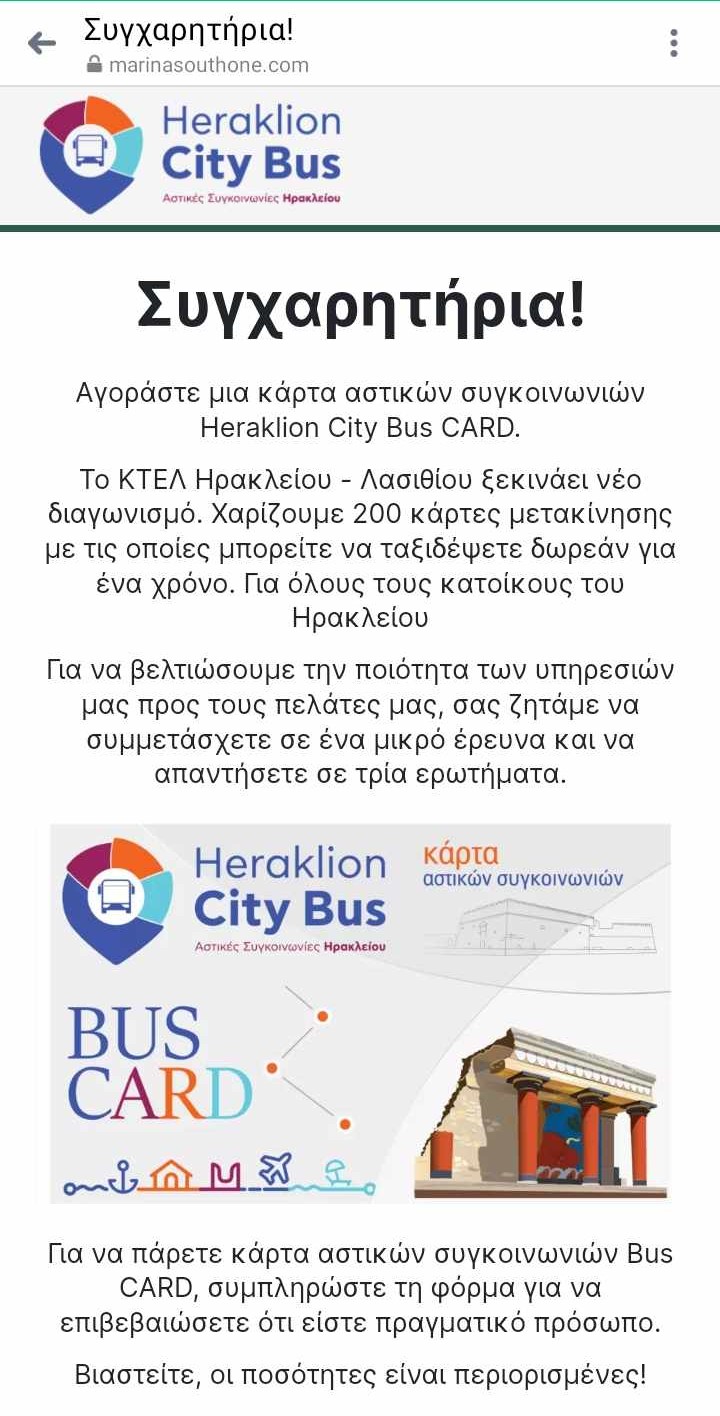 Οι απατεώνες παροτρύνουν ανυποψίαστους πολίτες να κάνουν αίτηση προκειμένου να αποκτήσουν μια Heraklion City Bus CARD διάρκειας 12 μηνών, έναντι δύο ευρώ και έπειτα ζητά στοιχεία τραπεζικού λογαριασμού.
