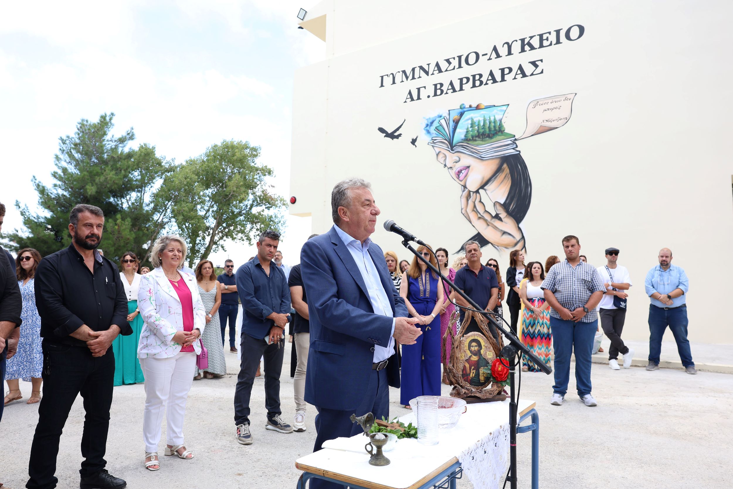 Στο πλαίσιο του καθιερωμένου αγιασμού για την έναρξη της νέας σχολικής χρονιάς πραγματοποιήθηκαν σήμερα τα εγκαίνια της ανακαινισμένης σχολικής μονάδας του Γυμνασίου – Λυκείου Αγίας Βαρβάρας του Δήμου Γόρτυνας, παρουσία του Περιφερειάρχη Κρήτης Σταύρου Αρναουτάκη, του Δημάρχου Γόρτυνας Μιχάλη Κοκολάκη και τοπικών φορέων.