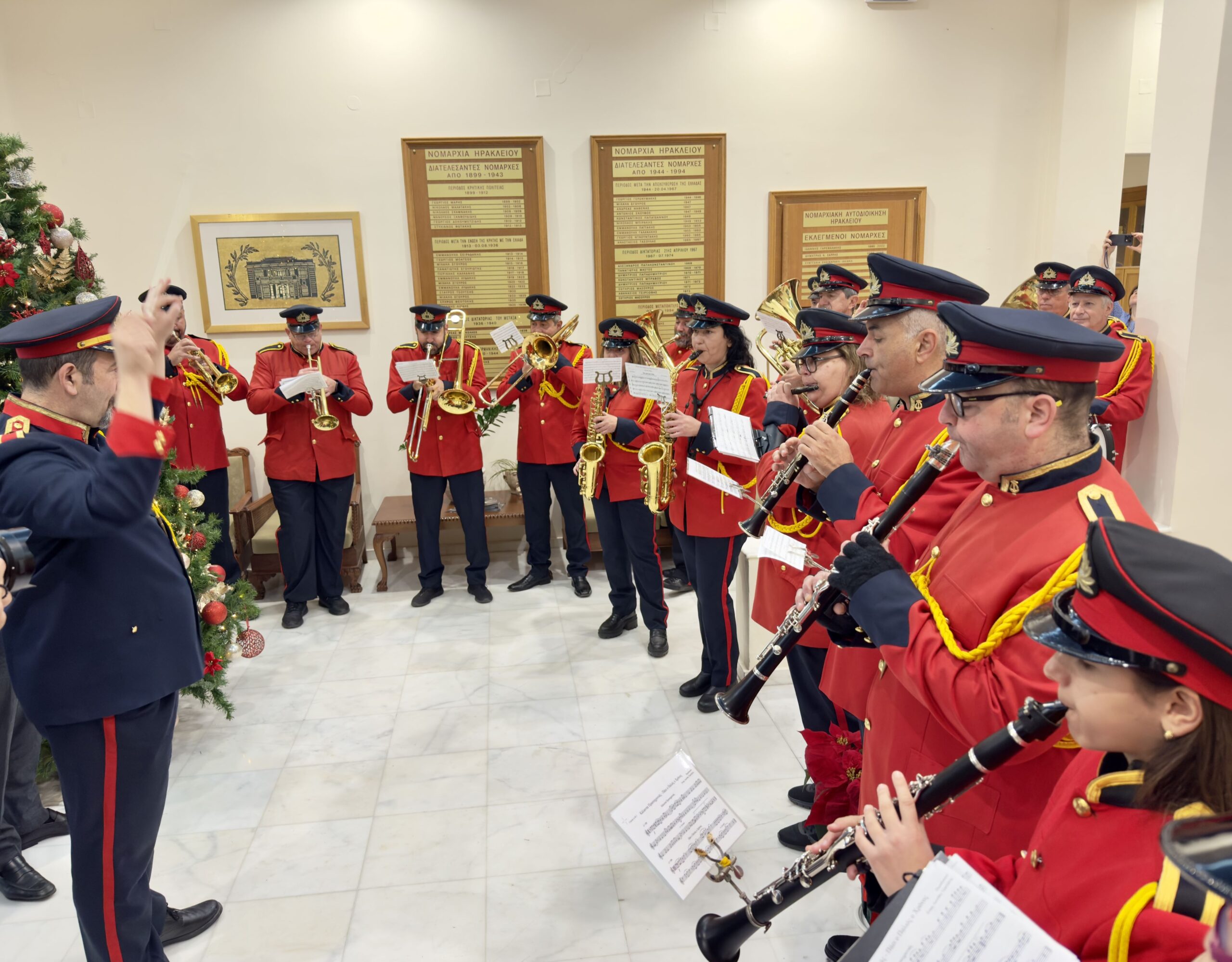 Την αρχή έκανε η Φιλαρμονική του Δήμου Ηρακλείου, παιανίζοντας γιορτινές μελωδίες, ενώ ακολούθησε το Λύκειο Ελληνίδων Ηρακλείου, τα μέλη του οποίου έψαλαν τα παραδοσιακά κάλαντα, μεταφέροντας το παραδοσιακό, γιορτινό μήνυμα των ημερών.