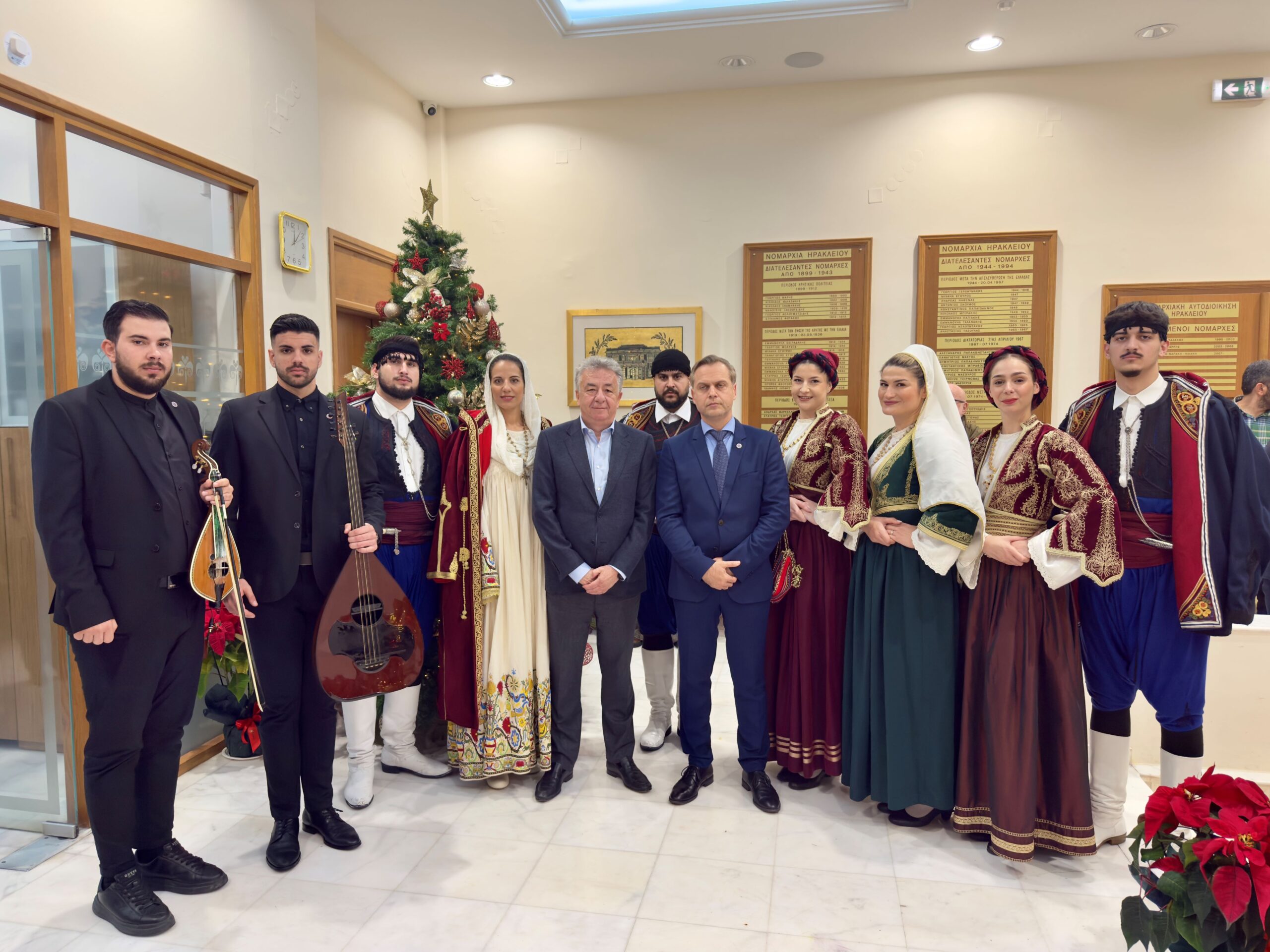 Σε εορταστικό κλίμα και με παραδοσιακά ακούσματα πλημμύρισε σήμερα, παραμονή Πρωτοχρονιάς, το κτίριο της Περιφέρειας Κρήτης. Φορείς, σύλλογοι και εκπρόσωποι των ενόπλων δυνάμεων επισκέφθηκαν τον Περιφερειάρχη Κρήτης Σταύρο Αρναουτάκη για να ψάλουν τα κάλαντα και να ανταλλάξουν ευχές για το νέο έτος.