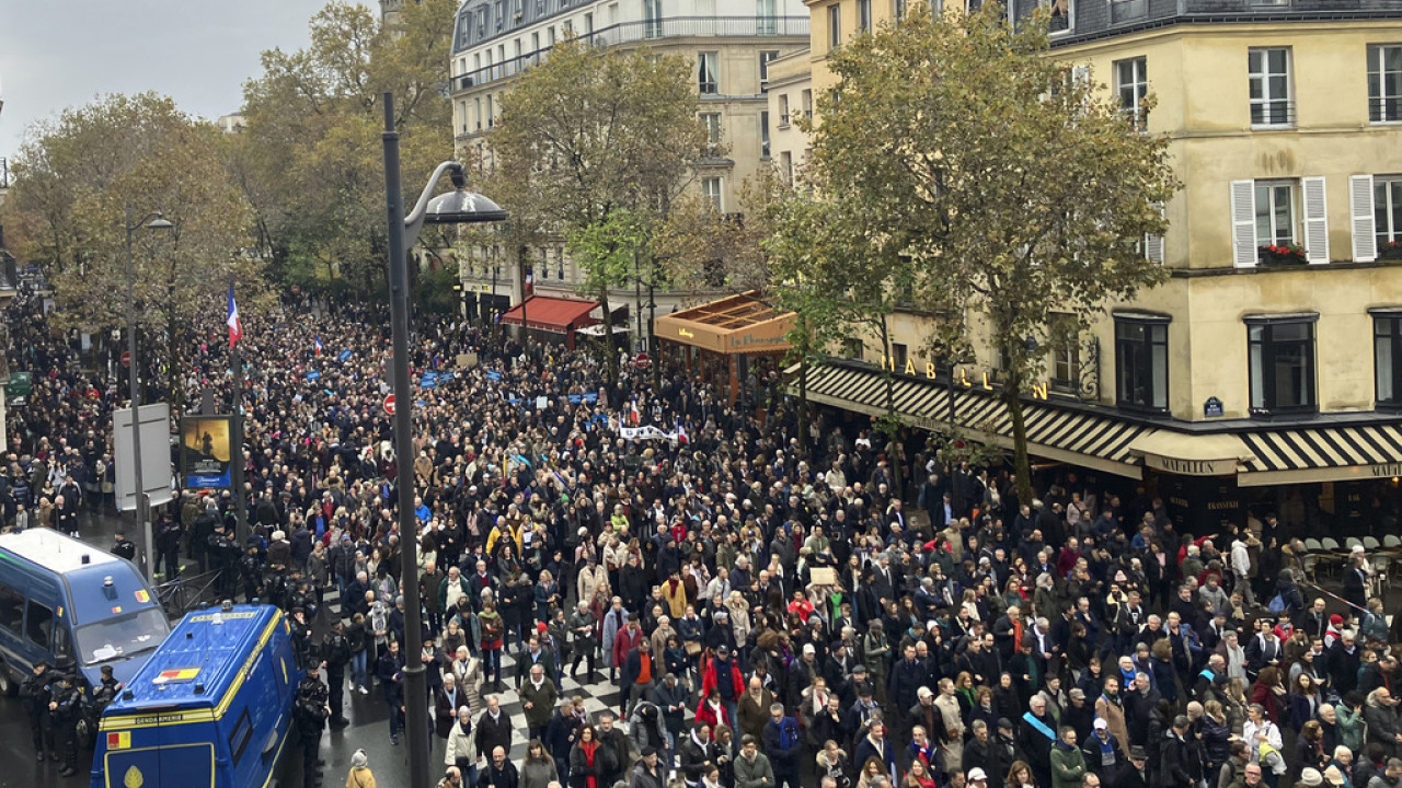 Η Place de la République, στην καρδιά της πρωτεύουσας της Γαλλίας, ήταν γεμάτη κόσμο. Στο άγαλμα στο κέντρο της τοποθετήθηκαν παλαιστινιακές σημαίες και πανό που ανέγραφε «Σταματήστε τη γενοκτονία».