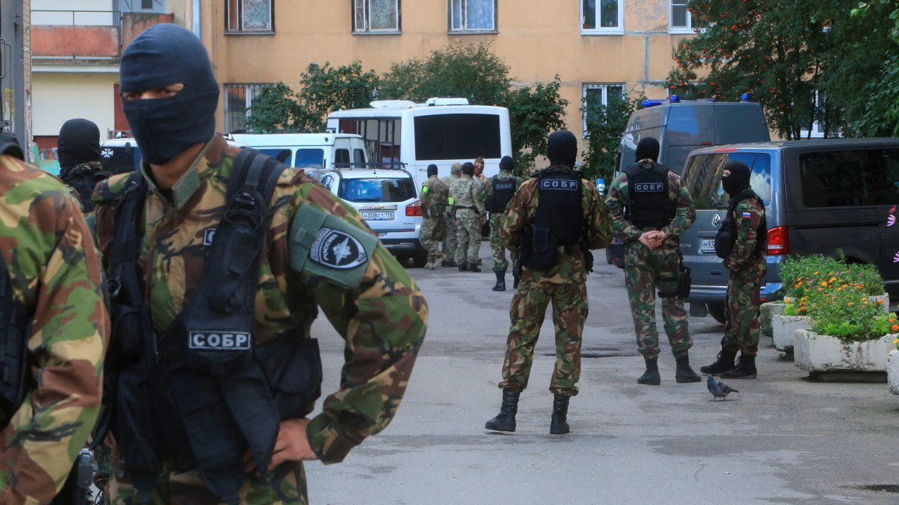 Βίντεο που μετέδωσε το πρακτορείο Ria Novosti δείχνει πράκτορα της FSB με καλυμμένα το πρόσωπο με μπαλακλάβα να βάζει χειροπέδες σε νεαρή γυναίκα που φορά λευκό μπουφάν και λευκό σκούφο κατεβασμένο ως τα μάτια της.
