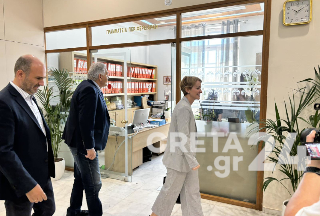 Η κ. Σδούκου που βρίσκεται στην Κρήτη στο πλαίσιο επίσκεψης κυβερνητικού κλιμακίου στο νησί για τις ευρωεκλογές, επισκέφθηκε το πρωί στην Περιφέρεια Κρήτης, όπου είχε σύσκεψη με την Περιφερειακή αρχή με βασικό θέμα τα θαλάσσια αιολικά πάρκα.
