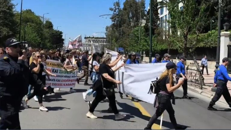 Το δικό τους «SOS» εξέπεμψαν σήμερα από το κέντρο της Αθήνας εκατοντάδες σχολικές καθαρίστριες από την Αθήνα και άλλες περιοχές της χώρας, στο πλαίσιο της απεργιακής τους κινητοποίησης, με βασικό αίτημα τη μόνιμη και σταθερή εργασία.