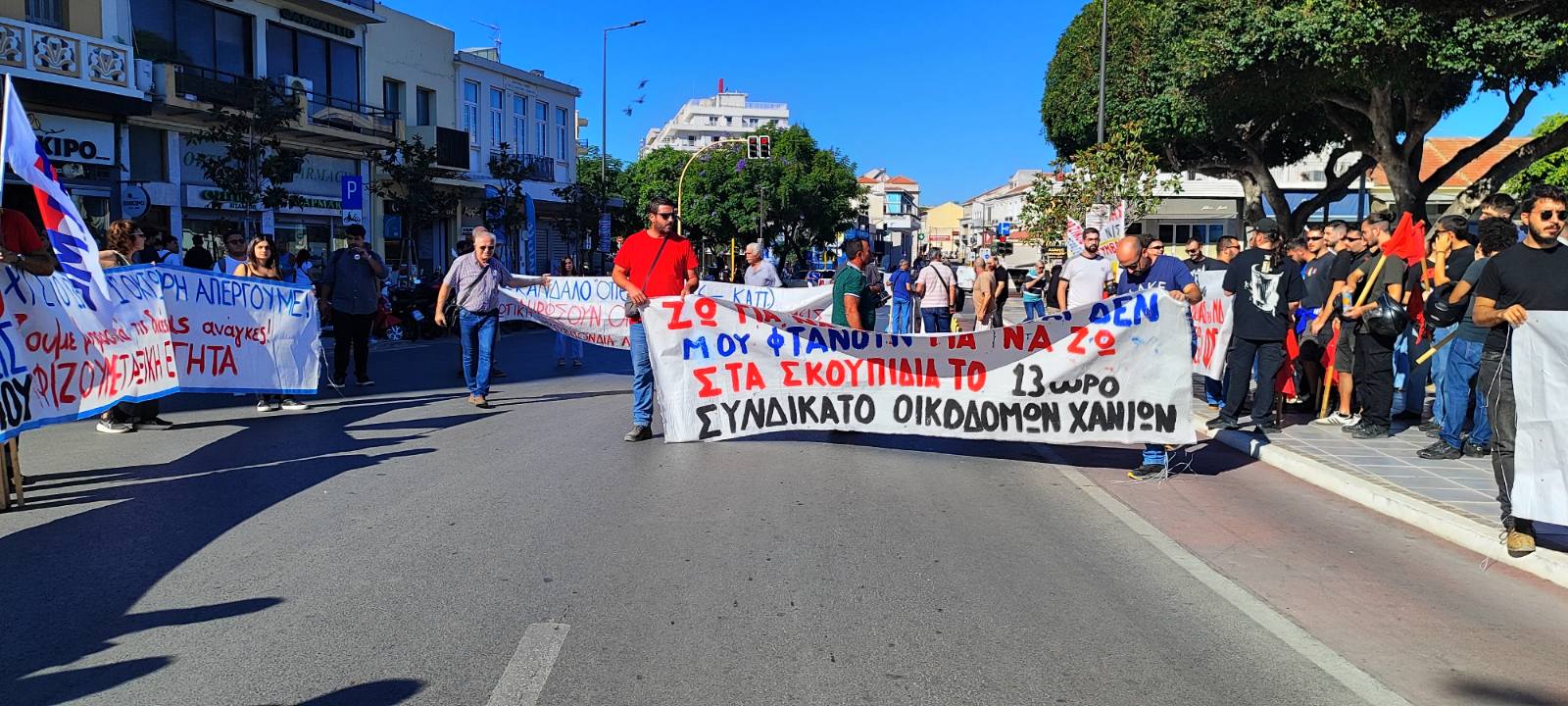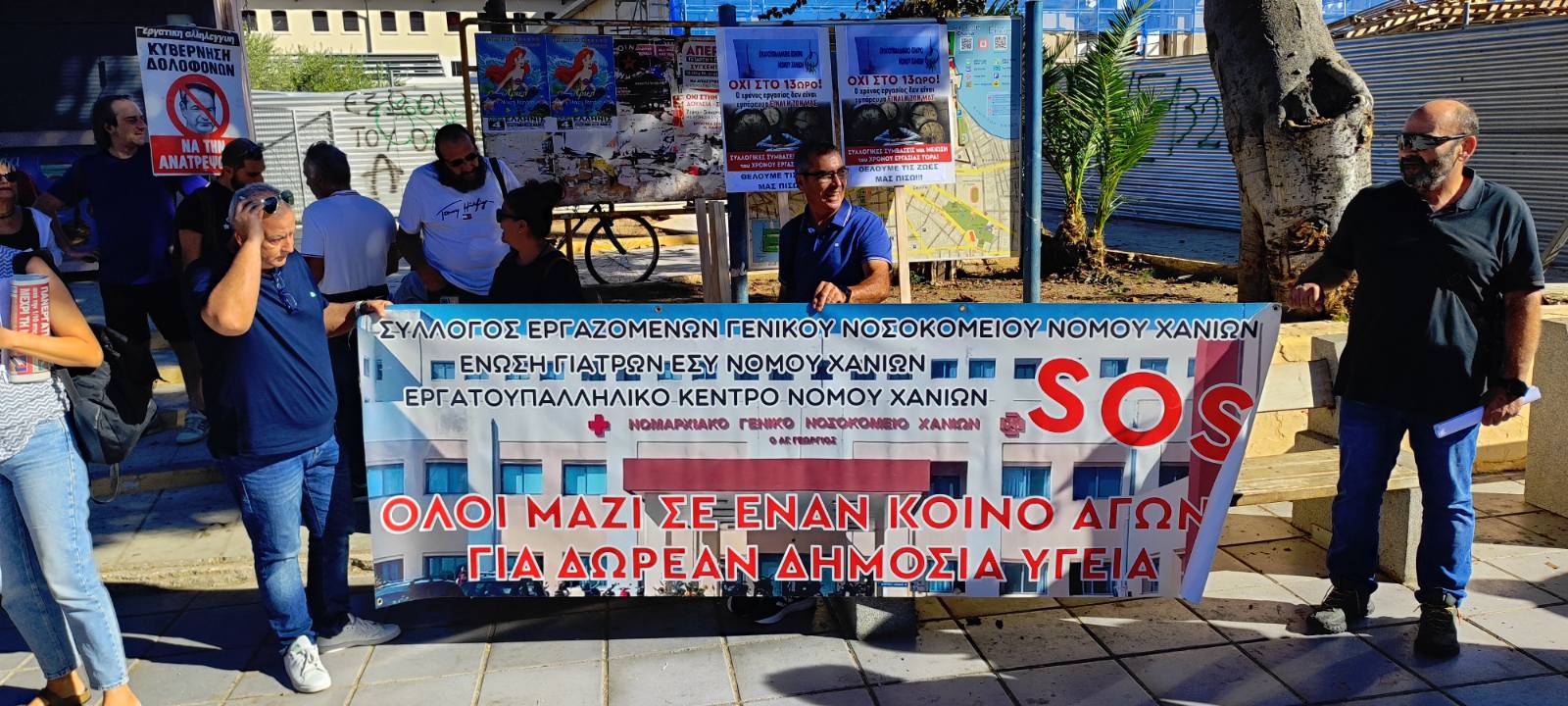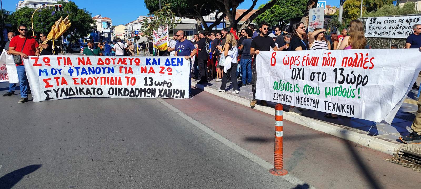 Στα Χανιά, εργαζόμενοι έχουν συγκεντρωθεί στην πλατεία αγοράς, όπου με πανό και συνθήματα διαδηλώνουν ενάντια στο 13ωρο.