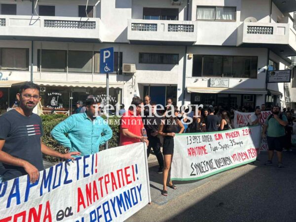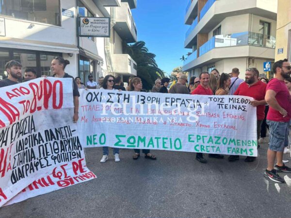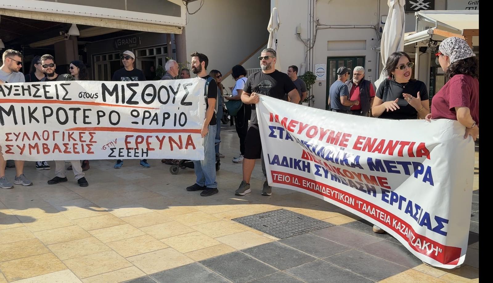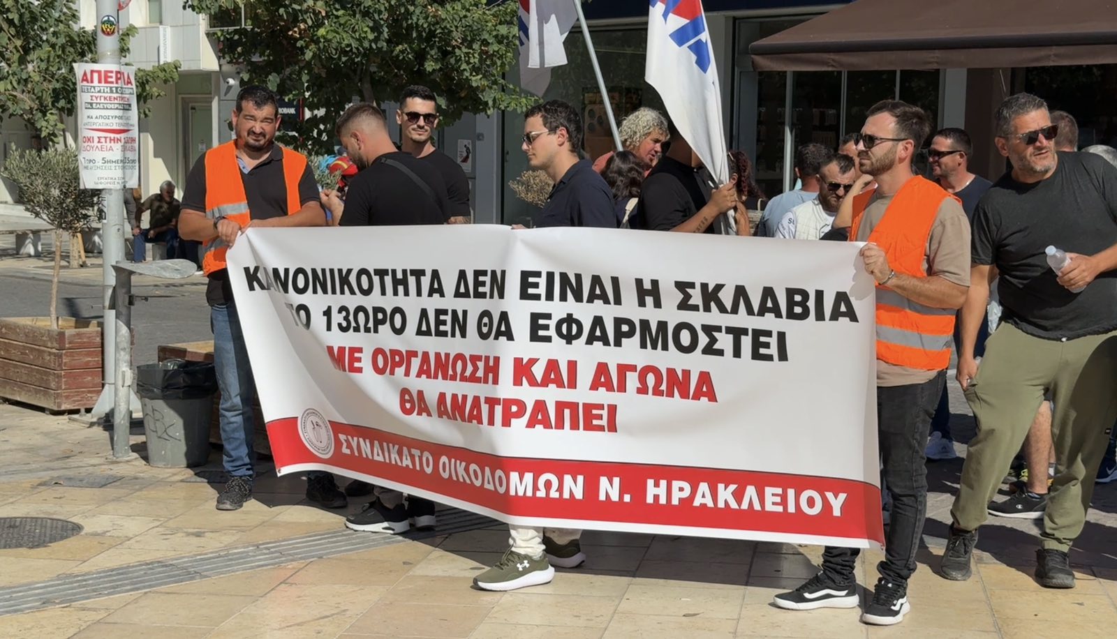 Στα Χανιά, εργαζόμενοι έχουν συγκεντρωθεί στην πλατεία αγοράς, όπου με πανό και συνθήματα διαδηλώνουν ενάντια στο 13ωρο.