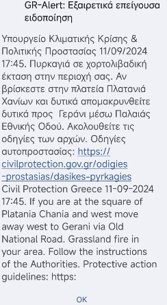 Νωρίτερα και πιο συγκεκριμένα στις 16:48 εστάλη μήνυμα από το 112 στους κατοίκους του Πλατανιά, να παραμείνουν σε ετοιμότητα και να ακολουθούν τις οδηγίες των Αρχών.