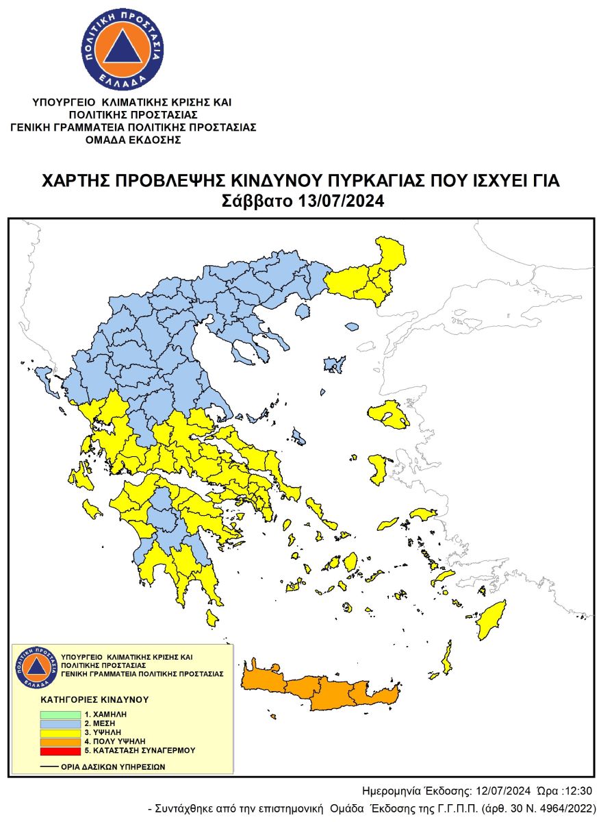 Η Πολιτική Προστασία Περιφέρειας Κρήτης ενημερώνει ότι, σύμφωνα με τον ημερήσιο Χάρτη Πρόβλεψης Κινδύνου Πυρκαγιάς της Γενικής Γραμματείας Πολιτικής Προστασίας για αύριο Σάββατο 13 Ιουλίου 2024 η κατηγορία Κινδύνου Πυρκαγιάς για όλη την Κρήτη, είναι κατηγορίας κινδύνου 4 (πολύ υψηλός).