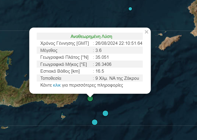 Σύμφωνα με την αναθεωρημένη λύση του Γεωδυναμικού Ινστιτούτου του Αστεροσκοπείου Αθηνών η σεισμική δόνηση σημειώθηκε στη 1:10, 9 χιλιόμετρα Νοτιοανατολικά της Ζάκρου.