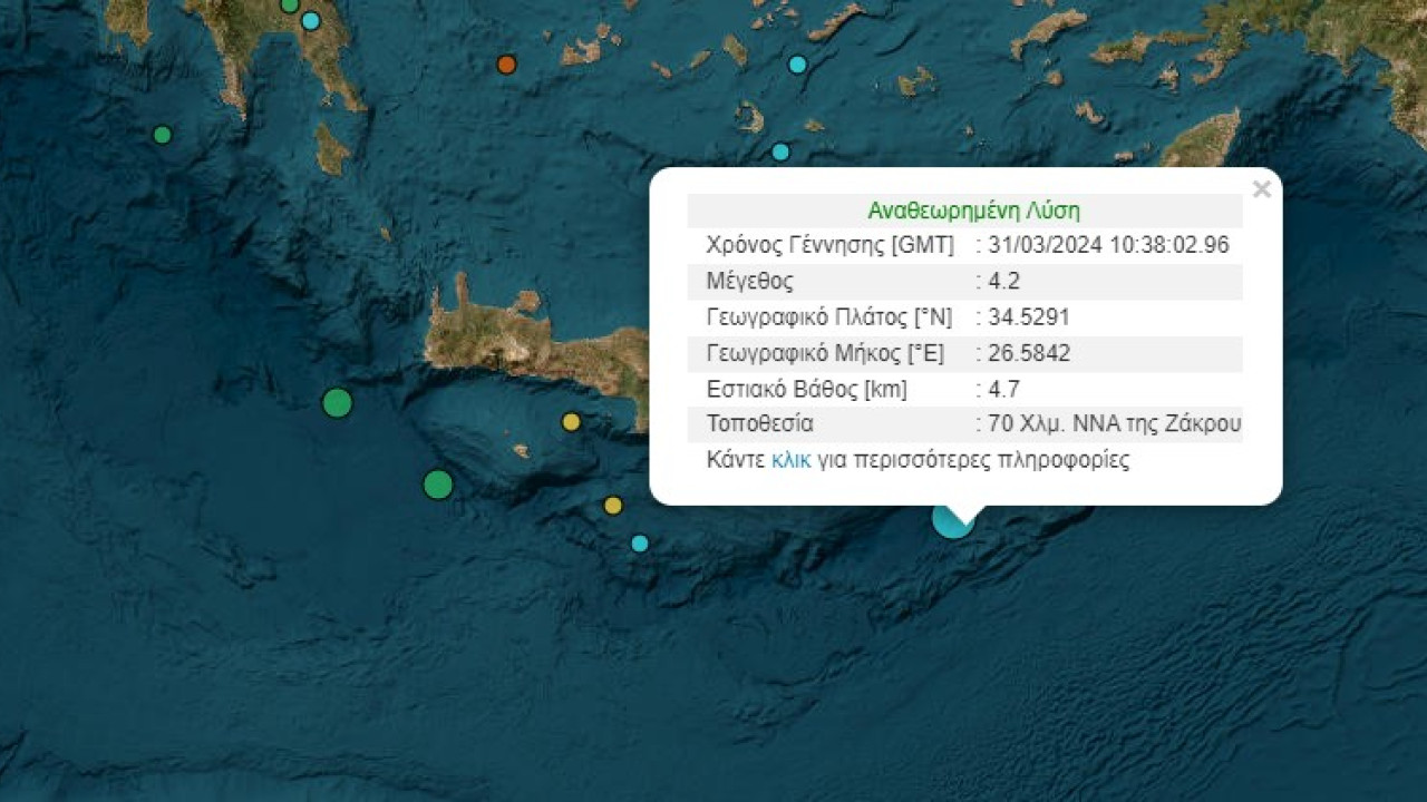 Το επίκεντρο του σεισμού εντοπίζεται 70 χιλιόμετρα νοτιο- νοτιοανανατολικά της Ζάκρου Λασιθίου