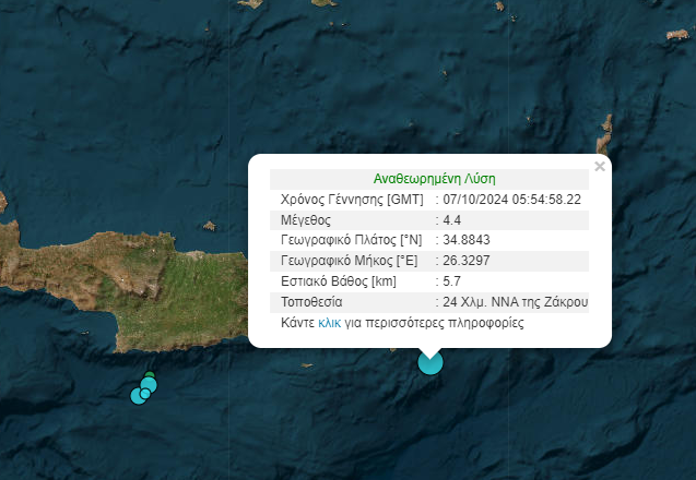 Σύμφωνα με το Γεωδυναμικό Ινστιτούτο o σεισμός σημειώθηκε στις 8:55 και το επίκεντρο εντοπίζεται 24χλμ. νότια νοτιοανατολικά της Ζάκρου.
