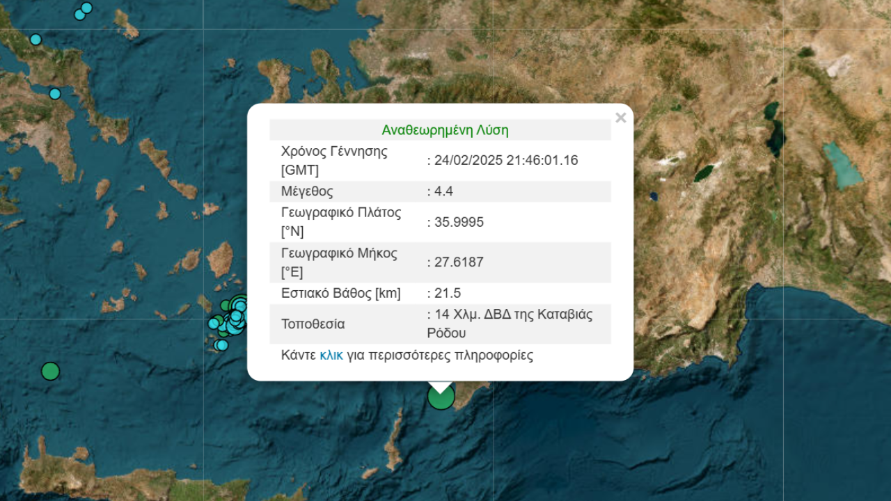 Συγκεκριμένα, σύμφωνα με την αναθεωρημένη λύση του γεωδυναμικού ινστιτούτου, η σεισμική δόνηση καταγράφηκε στις 11:42 με επίκεντρο τη θαλάσσια περιοχή 4 χλμ. ΔΒΔ της Καταβιάς Ρόδου. Το εστιακό της βάθος εντοπίζεται στα 21.5 χλμ.