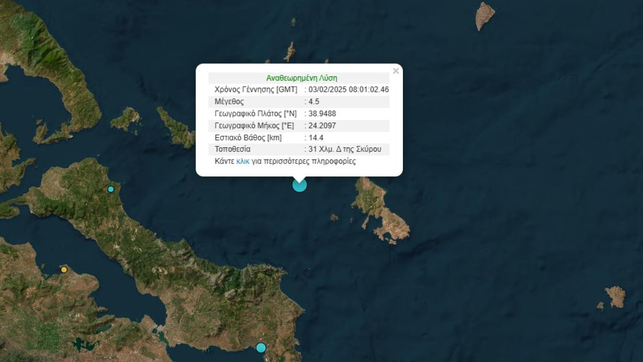 Το επίκεντρο της δόνησης εντοπίζεται στον θαλάσσιο χώρο 32 χλμ. δυτικά της Σκύρου,