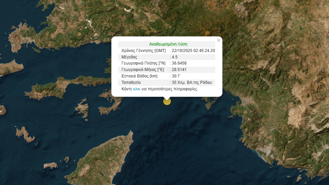 Σεισμική δόνηση μεγέθους 4,5 βαθμών της κλίμακας Ρίχτερ εκδηλώθηκε στις 05:45 τα ξημερώματα της Τετάρτης στα ανοιχτά της Ρόδου.