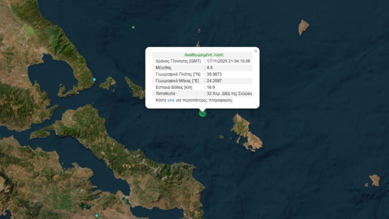 Το επίκεντρο υπολογίζεται 32 χιλιόμετρα δυτικά, βορειοδυτικά της Σκύρου.