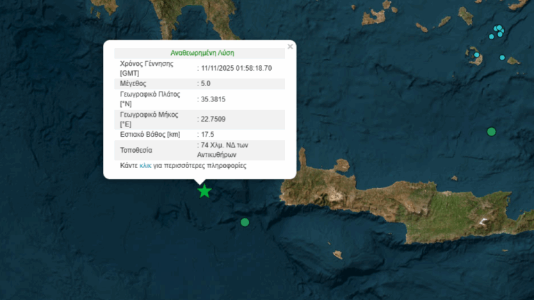 Σεισμός με μέγεθος 5 Ρίχτερ της κλίμακας Ρίχτερ σημειώθηκε δύο λεπτά πριν από τις 4 τα ξημερώματα της Τρίτης στη θαλάσσια περιοχή 74 χιλιόμετρα Νοτιοδυτικά των Αντικυθήρων.
