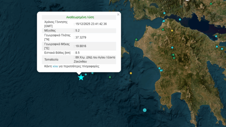 Σεισμική δόνηση μεγέθους 5,2 βαθμών της κλίμακας Ρίχτερ σημειώθηκε στις 01:41 τα ξημερώματα της Τρίτης, στα ανοιχτά της Ζακύνθου.