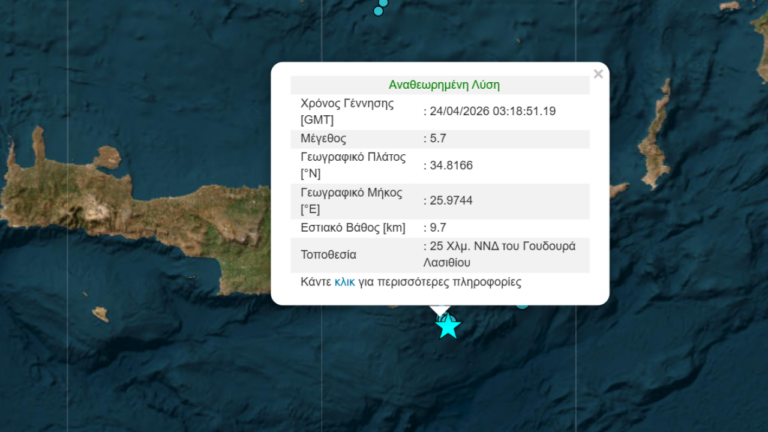 Σεισμική δόνηση μεγέθους 5,7 βαθμών της κλίμακας Ριχτερ σημειώθηκε στις 06:18 τα ξημερώματα της Παρασκευής στα ανοιχτά της Κρήτης.