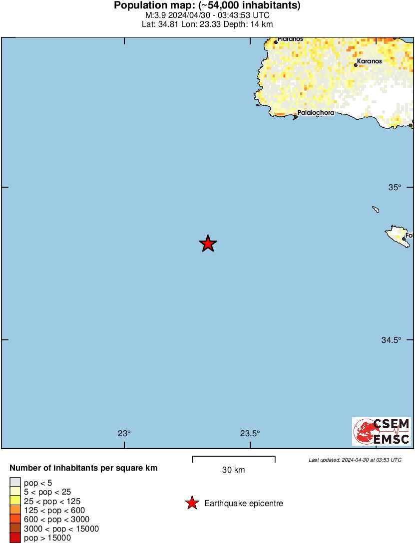 H αναθεωρημένη λύση του Γεωδυναμικού Ινστιτούτου του Αστεροσκοπείου Αθηνών δίνει το σεισμό στα 3,7 Ρίχτερ, με εστιακό βάθος τα 14,8 χλμ., και επίκεντρο τα 56 χλμ. νοτιοδυτικά της Παλαιοχώρας Χανίων.