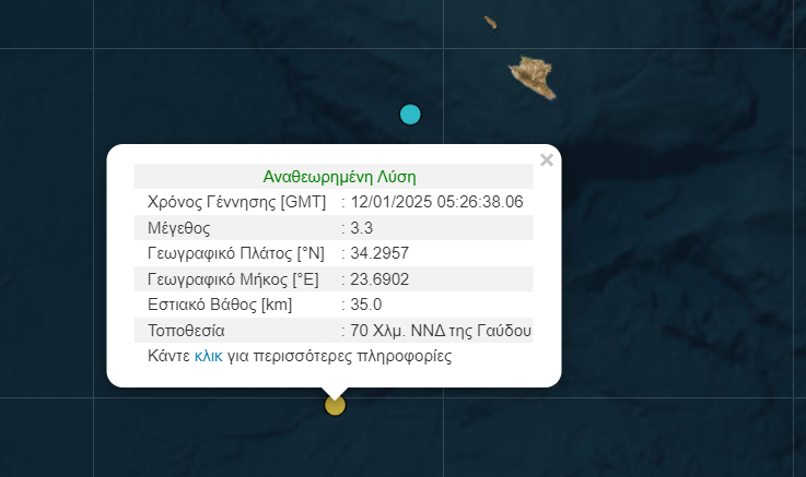 Σύμφωνα με την αναθεωρημένη λύση του Γεωδυναμικού Ινστιτούτου του Αστεροσκοπείου Αθηνών η σεισμική δόνηση σημειώθηκε 70 χιλιόμετρα νότια νοτιοδυτικά της Γαύδου.