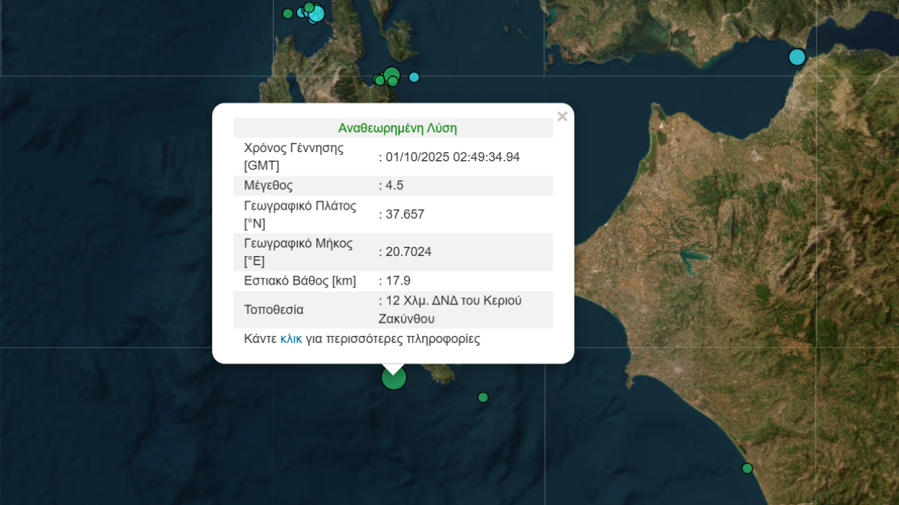 Σεισμική δόνηση μεγέθους 4,5 βαθμών της κλίμακας Ρίχτερ σημειώθηκε στις 05:49 τα ξημερώματα της Τετάρτης, ανοικτά των νοτιοδυτικών ακτών της Ζακύνθου.