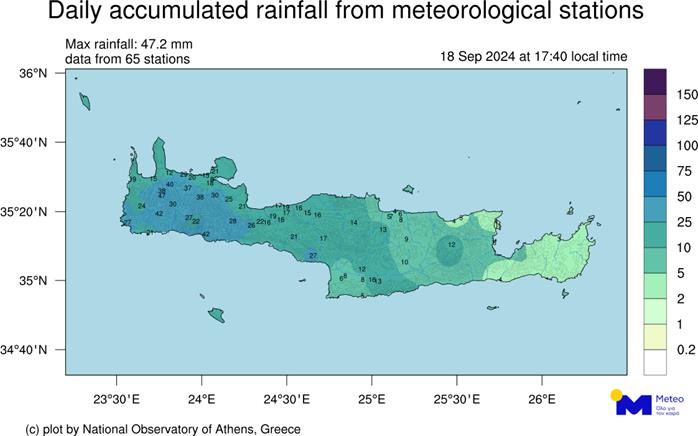 Στον πίνακα δίνονται τα 8 μεγαλύτερα ύψη βροχής μέχρι τις 6 το απόγευμα της Τετάρτης, όπως κατεγράφησαν από δίκτυο των 65 σταθμών που λειτουργεί το meteo.gr/Εθνικό Αστεροσκοπείο Αθηνών στο νησί, ενώ στον χάρτη που ακολουθεί δίνεται η γεωγραφική κατανομή των βροχοπτώσεων από το δίκτυο μας.