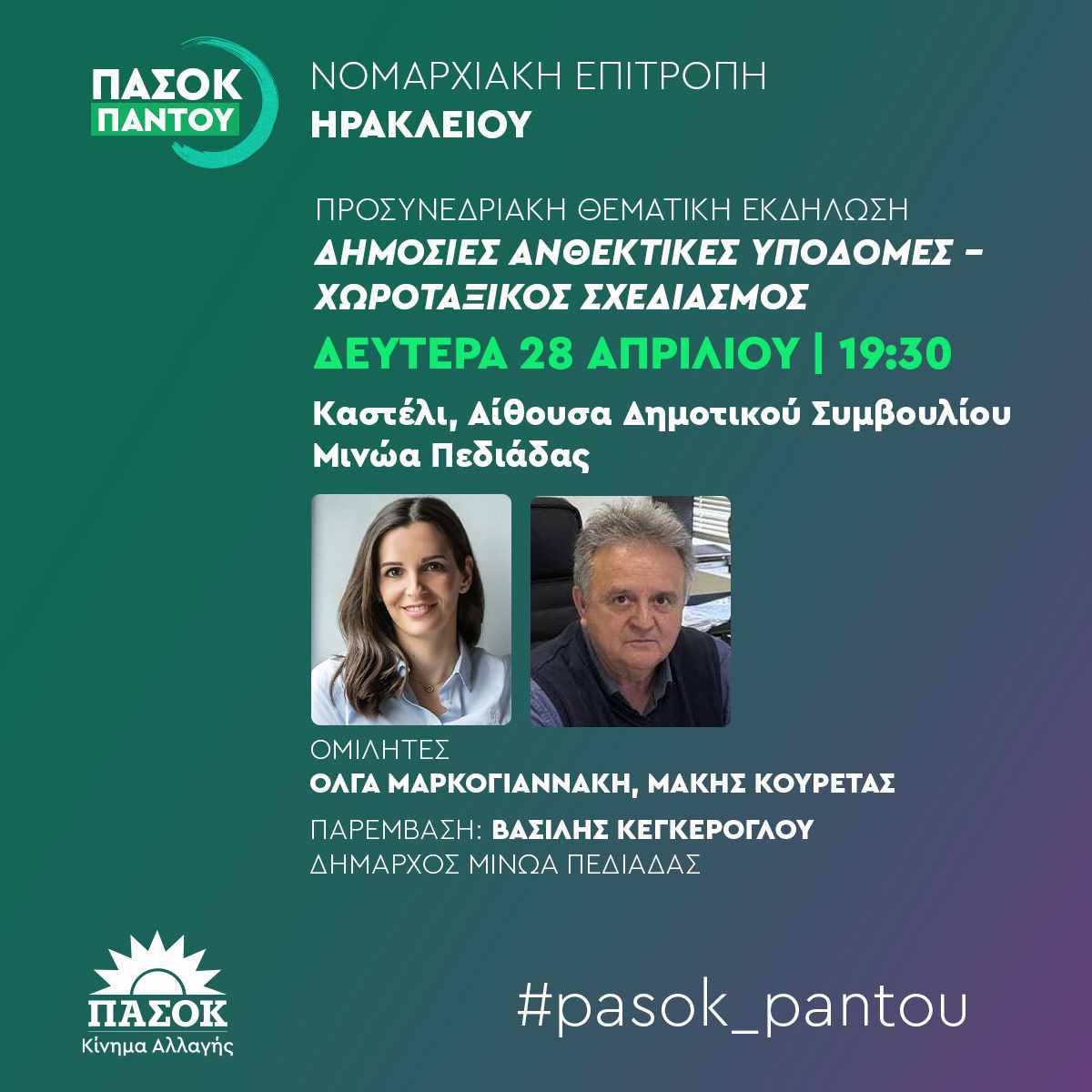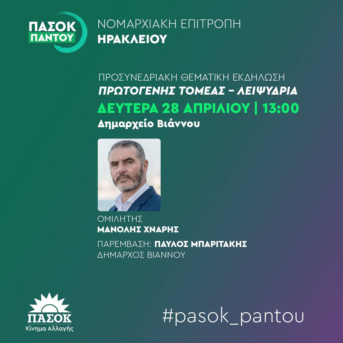 Σήμερα θα πραγματοποιηθούν οι θεματικές εκδηλώσεις του ΠΑΣΟΚ, σε Βιάννο και Καστέλλι.