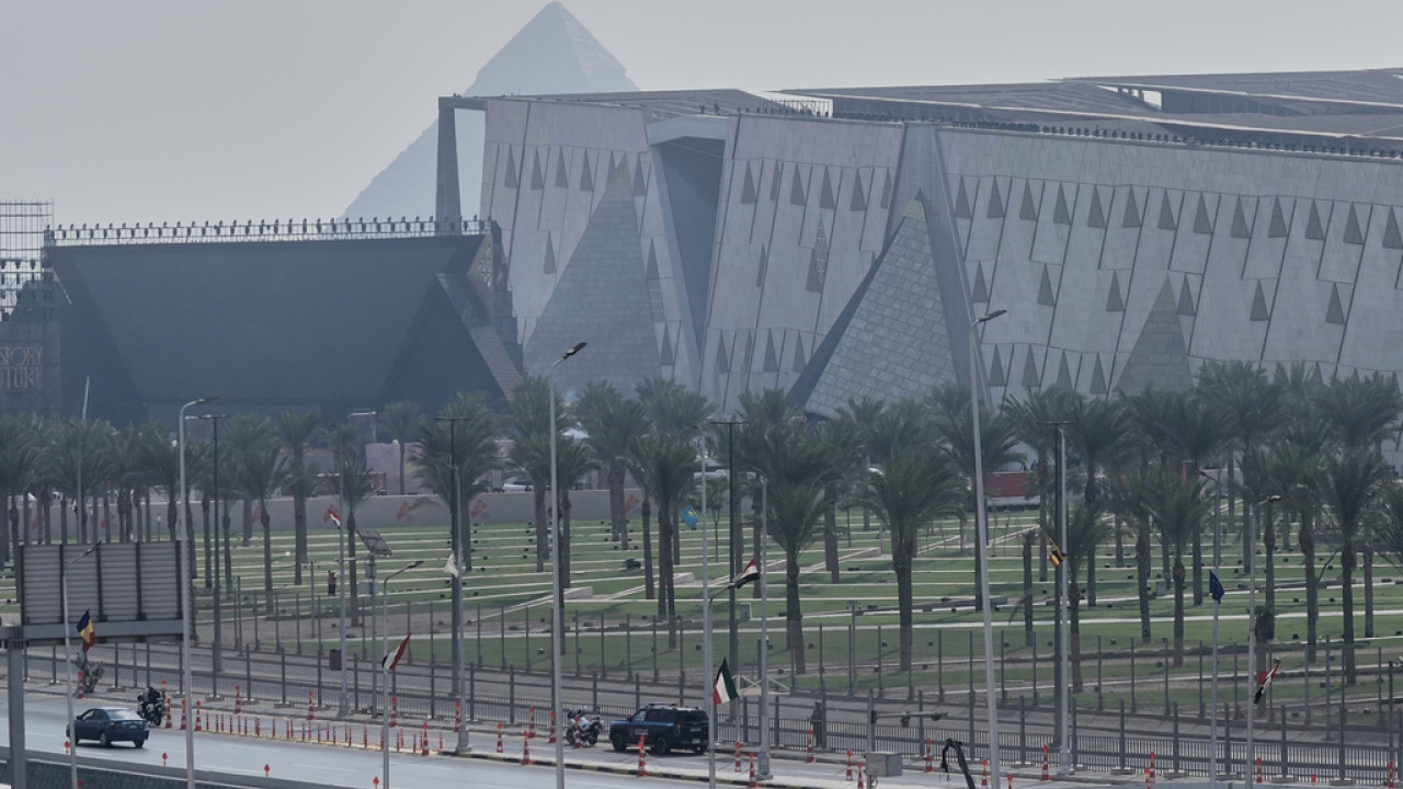 Προοίμιο του θεάματος των εγκαινίων, η μνημειώδης πρόσοψη του μουσείου, με την πανοραμική θέα στο οροπέδιο της Γκίζας και τις πυραμίδες της, που φωταγωγείται τις τελευταίες νύχτες. Σήμερα το πρωί, ισχυρή ομάδα ασφαλείας αναπτύχθηκε γύρω από το μουσείο και τεράστιες αιγυπτιακές σημαίες υψώθηκαν σε μια γέφυρα με θέα τον κεντρικό δρόμο, σύμφωνα με τον ανταποκριτή του Γαλλικού Πρακτορείου που βρίσκεται στο σημείο.