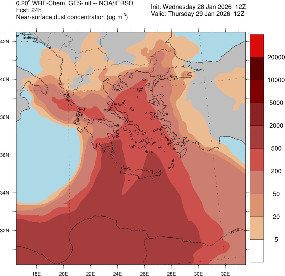Πέμπτη 29/01/2026 με ένα επεισόδιο μεταφοράς αφρικανικής σκόνης στα νότια τμήματα της χώρας και ιδιαιτέρως στην Κρήτη και στη νότια Πελοπόννησο, όπως διακρίνεται και στο χάρτη πρόγνωσης για το μεσημέρι της Πέμπτης, από το μοντέλο DUST/METEO του Εθνικού Αστεροσκοπείου Αθηνών.