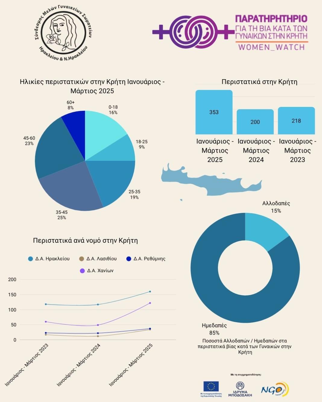Σύμφωνα με την τέταρτη Έκθεση του «Παρατηρητηρίου για τη Βία κατά των Γυναικών στην Κρήτη WOMEN_WATCH», που λειτουργεί στο πλαίσιο του Προγράμματος BUILD, με Φορέα υλοποίησης τον «Σύνδεσμο Μελών Γυναικείων Σωματείων Ηρακλείου και Ν. Ηρακλείου», στο διάστημα Ιανουάριος-Μάρτιος 2025, διαπιστώνεται ότι οι καταγγελίες προς την ΕΛΑΣ είναι μοιρασμένες ανά φύλο, τόσο αγόρια όσο και κορίτσια, ενώ τα δεδομένα προηγούμενων χρόνων έδειχναν κυρίως τα κορίτσια να πλήττονται από το φαινόμενο. Πρόκειται για δεδομένα που, σύμφωνα με το «Παρατηρητήριο» χρήζουν περαιτέρω αξιολόγησης, τόσο σε επίπεδο 12μήνου όσο και σε επίπεδο σοβαρότητας περιστατικών και είδους κακοποίησης.