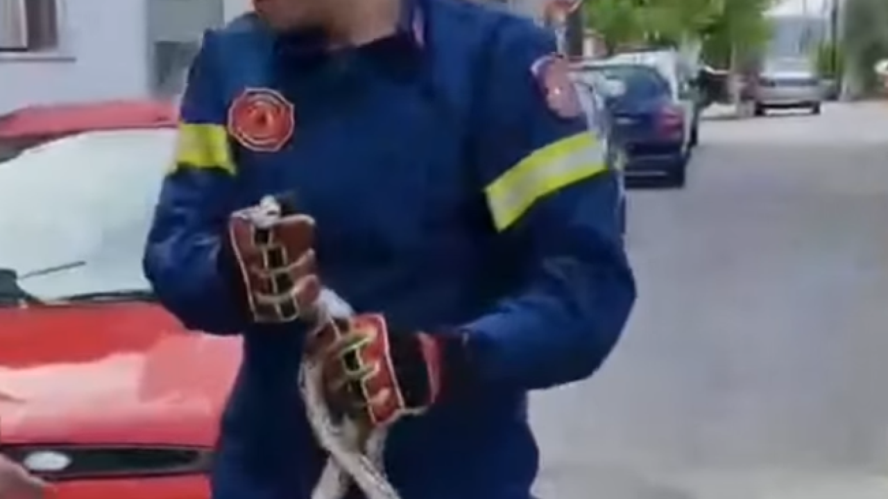 Με ψυχραιμία και κατάλληλο εξοπλισμό, ο πυροσβέστης κατάφερε να πιάσει το φίδι και να το μεταφέρει σε ασφαλές φυσικό περιβάλλον, μακριά από κατοικημένη περιοχή.