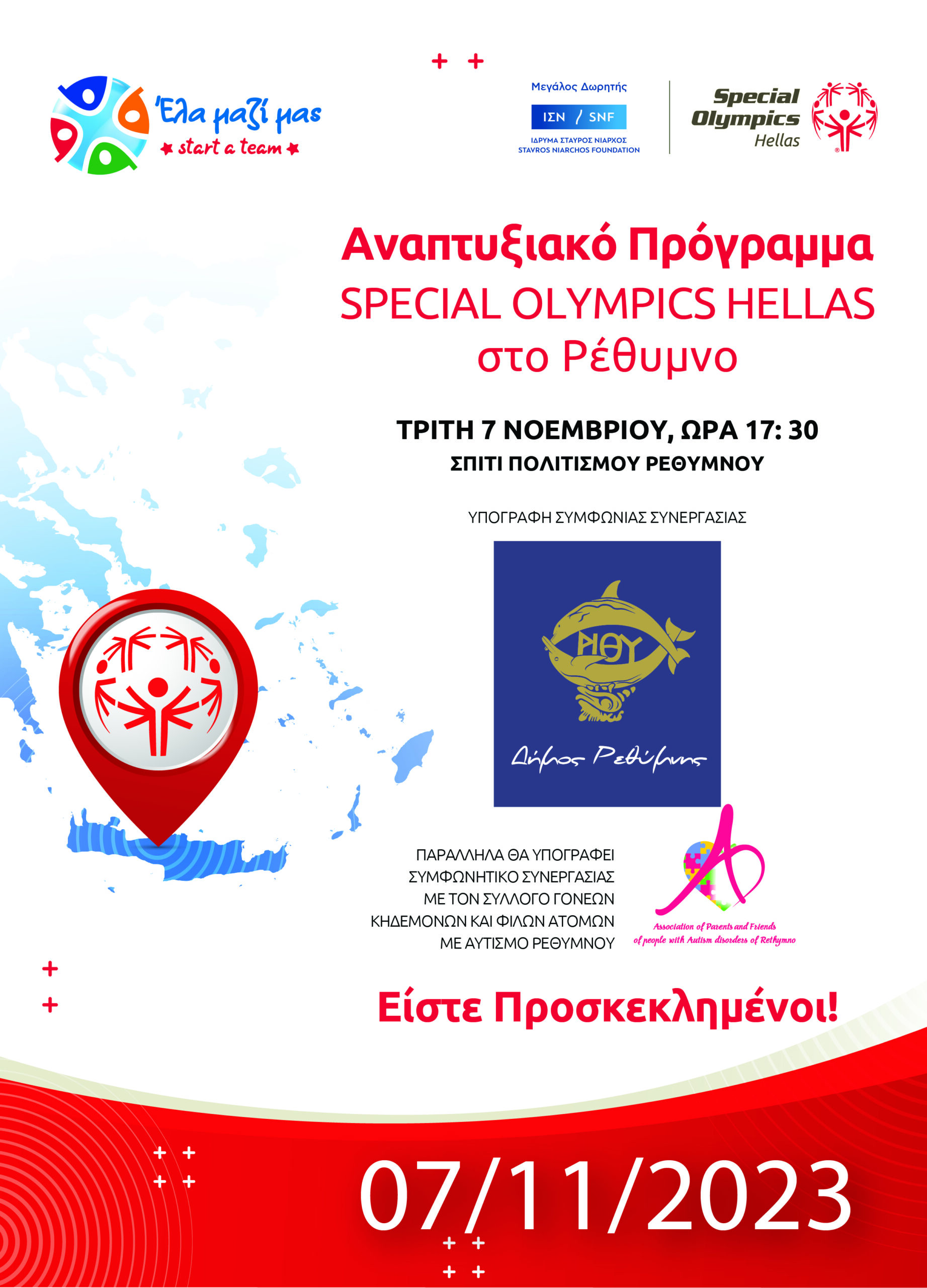 Την Τρίτη 7 Νοεμβρίου 2023 και ώρα 17:30, στο Σπίτι Πολιτισμού Ρεθύμνου θα γίνει η εκδήλωση έναρξης του Τοπικού Προγράμματος Special Olympics Ρεθύμνου που οργανώνεται από το διεθνή αθλητικό οργανισμό SPECIAL OLYMPICS. Η εκδήλωση γίνεται στα πλαίσια του Αναπτυξιακού Προγράμματος με χορηγό το Ίδρυμα Σταύρος Νιάρχος, σε συνεργασία με το Δήμο Ρεθύμνου και τον Σύλλογο Γονέων, Κηδεμόνων και Φίλων Ατόμων με Αυτισμό Ρεθύμνου.