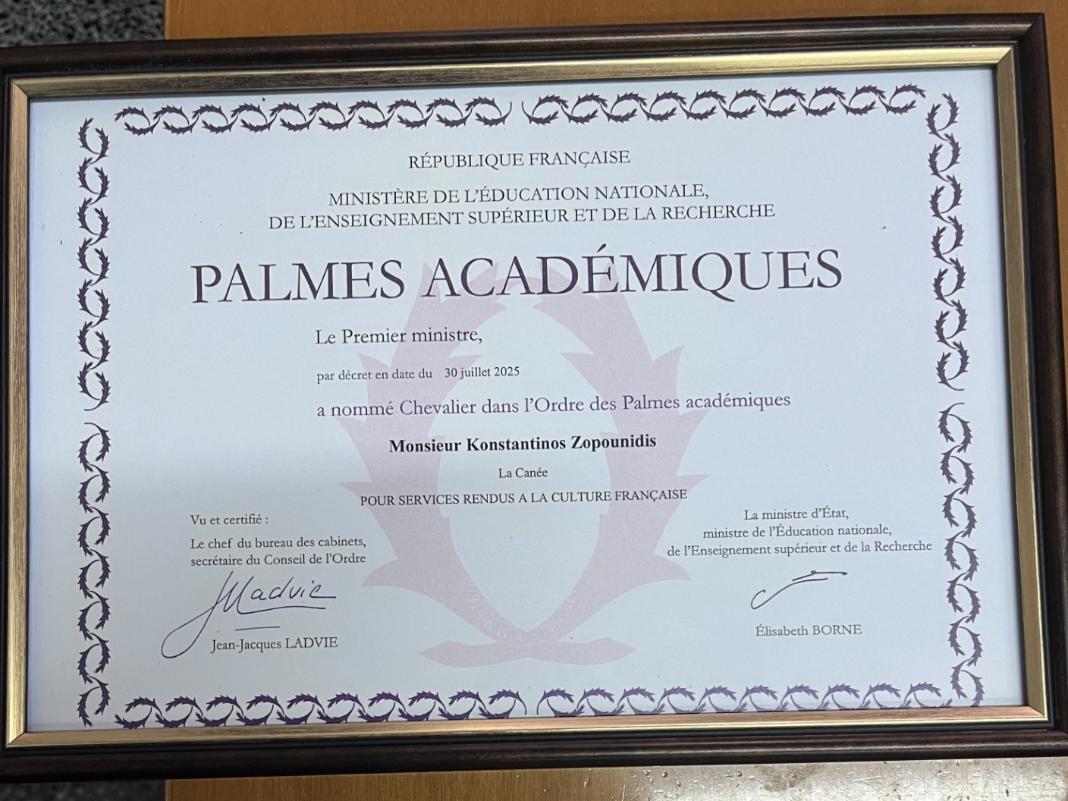 Η απονομή των Palmes Academiques γίνεται σε μια επίσημη τελετή που βασίζεται στην παράδοση. Ο Καθηγητής του Πολυτεχνείου Κρήτης Κωνσταντίνος Ζοπουνίδης θα παρασημοφορηθεί για το έργο του στη Χρηματοοικονομική Διοίκηση και το Μάνατζμεντ.