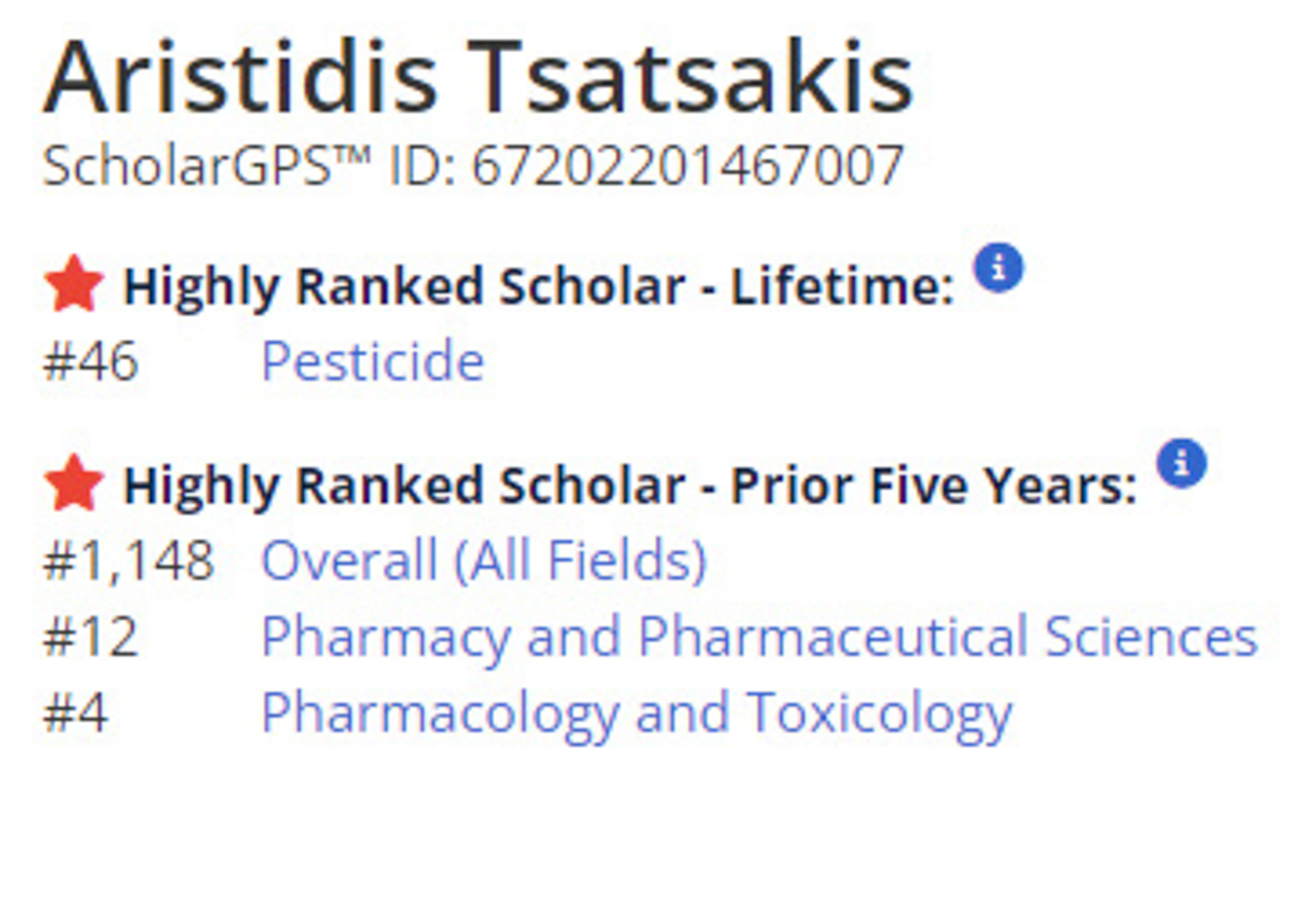 Ο Ακαδημαϊκός και Καθηγητής Τοξικολογίας του Πανεπιστημίου Κρήτης κος Αριστείδης Τσατσάκης αναδείχθηκε ως Highly Ranked Scholar από την ScholarGPSΤΜ, την πιο ολοκληρωμένη πλατφόρμα επιστημονικής ανάλυσης στον κόσμο, η οποία δημιουργήθηκε από μελετητές, με στόχο ναείναι προσβάσιμη προς όλους. Το ScholarGPSΤΜ γιορτάζει τους Highly Ranked Scholars™ για τις εξαιρετικές επιδόσεις τους σε διάφορους τομείς, κλάδους και ειδικότητες.