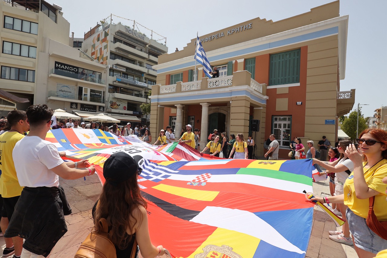 «Για ακόμη μία χρονιά σας καλωσορίζουμε στο Ηράκλειο και την Κρήτη. Σας υποδεχόμαστε στο σταθμό ενός Ευρωπαϊκού ταξιδιού, στη διάρκεια του οποίου, γίνεστε δρομείς σε μια λαμπαδηδρομία ανθρωπισμού. Μεταφέρετε την αισιοδοξία και το όραμα που χρειάζεται σήμερα η Ευρώπη. Στα δικά σας χέρια κρατιέται η αλυσίδα που ενώνει τους λαούς μας. Εσείς διαμορφώνετε την τύχη της Ενωμένης Ευρώπης των επόμενων δεκαετιών. Εσείς θα κληθείτε να δώσετε απαντήσεις στις μεγάλες προκλήσεις της εποχής, όπως την κλιματική αλλαγή, τις ανθρωπιστικές κρίσεις και βεβαίως τους πολέμους στην ευρύτερη γειτονιά μας. Είμαστε, όμως, βέβαιοι ότι θα τα καταφέρετε», υπογράμμισε ο Σταύρος Αρναουτάκης.