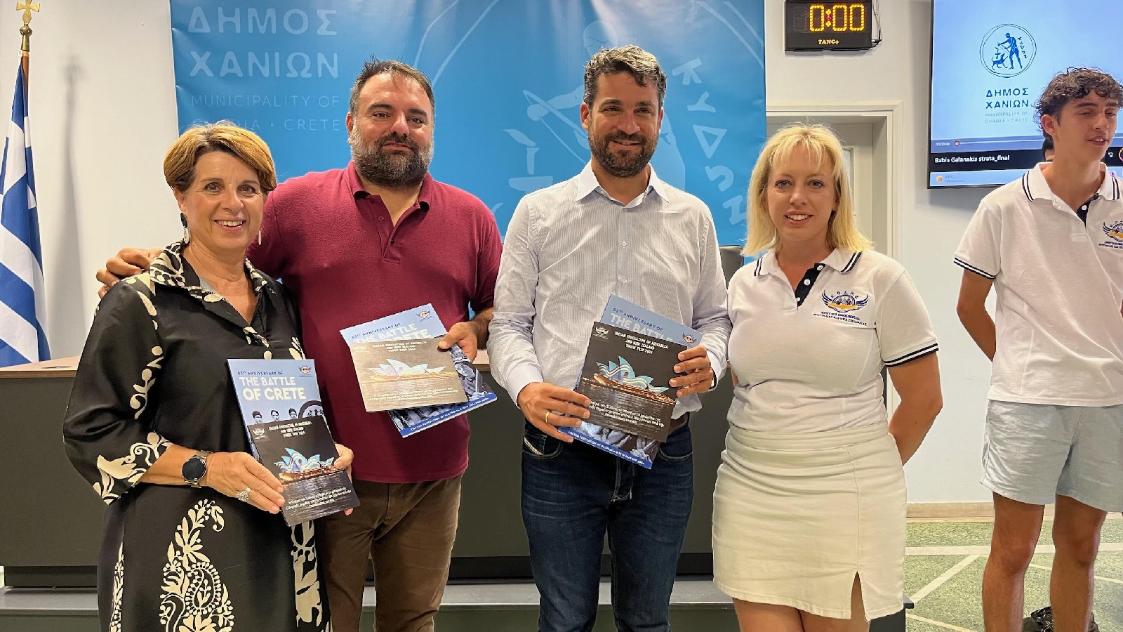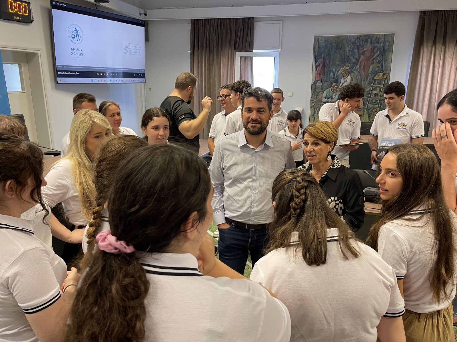 Τα νεαρά μέλη της Ομοσπονδίας, υποδέχθηκαν στην αίθουσα του Δημοτικού Συμβουλίου ο Δήμαρχος Χανίων, Παναγιώτης Σημανδηράκης, ο Αντιδήμαρχος Τουρισμού, Νεκτάριος Ψαρουδάκης και η Αντιδήμαρχος Κοινωνικής Πολιτικής, Ελένη Ζερβουδάκη.