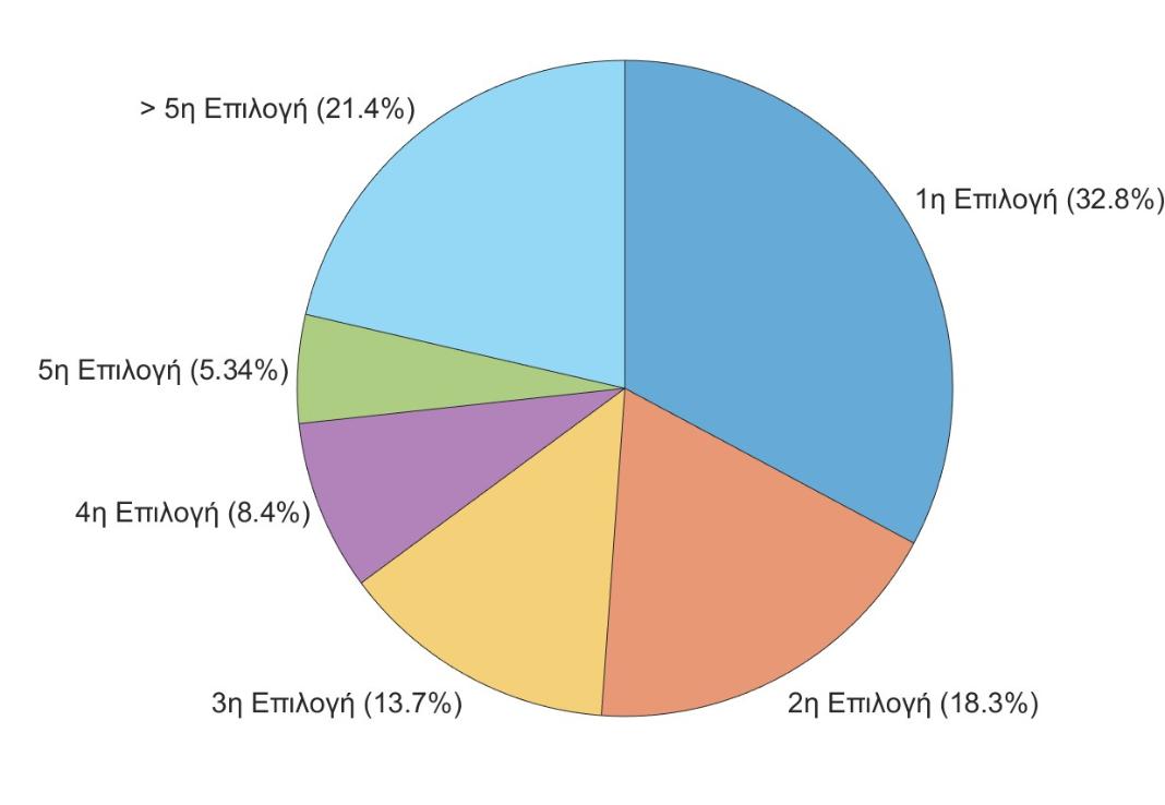 Σχήμα 2. Το ποσοστό των επιτυχόντων φοιτητών του Τμήματος ΔΕΤ, ως προς την σειρά προτίμησής τους, για τους 134 εισαχθέντες από όλες τις κατηγορίες.