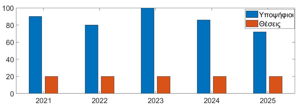 Σχήμα 3. Ο αριθμός υποψηφίων και διαθέσιμων θέσεων για τα πέντε έτη λειτουργίας του ΠΜΣ «Διοίκηση και Ψηφιακός Μετασχηματισμός».