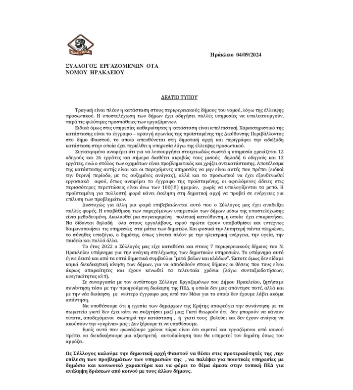 Με την συγκεκριμένη επιστολή, ο Σύλλογος ζητάει την διασφάλιση του δημόσιου και κοινωνικού χαρακτήρα των δημοτικών υπηρεσιών, την επάρκεια στην στελέχωση τους, αξιοπρεπείς συνθήκες εργασίας και παροχή ποιοτικών μέσων για την σωστή άσκηση των καθηκόντων των εργαζομένων. Παράλληλα, τονίζει την τραγική κατάσταση στους περιφερειακούς Δήμους του νομού Ηρακλείου λόγω της υποστελέχωσης, όπου παρά τις φιλότιμες προσπάθειες των εργαζομένων, πολλές υπηρεσίες υπολειτουργούν, όπως αυτή της καθαριότητας.