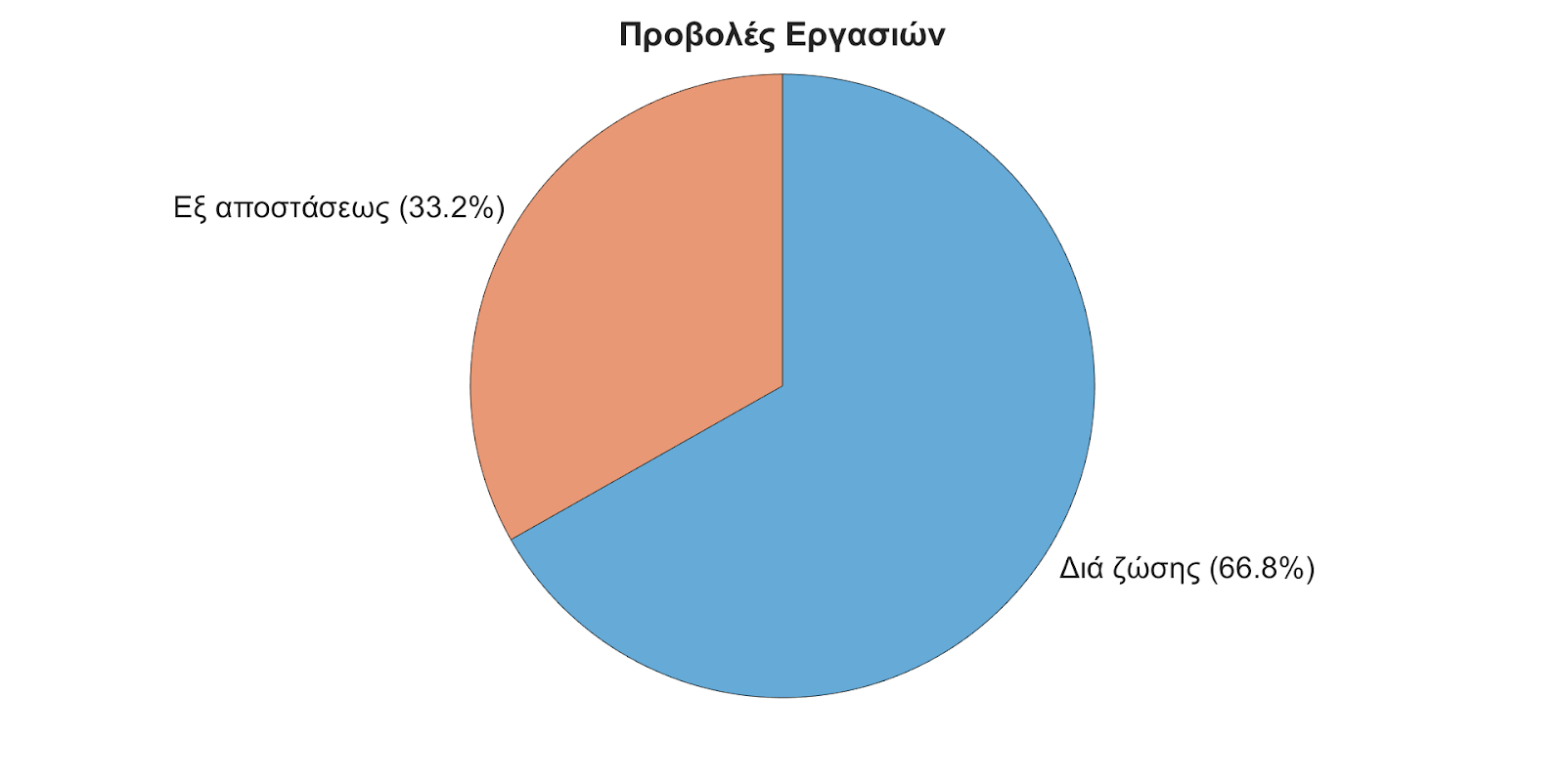 Τα Σχήματα 2 και 3 απεικονίζουν τον αριθμό των εργασιών ανά έτος σύμφωνα με την ημερομηνία δημοσίευσής τους ανά κατηγορία (διά ζώσης και εξ αποστάσεως) αλλά και τα αντίστοιχα ποσοστά. Σύμφωνα με τα Σχήματα αυτά, εντοπίστηκαν εργασίες από το 2013 και μετά, με τον αριθμό τους να αυξάνει ειδικά μετά το 2020 όπου λόγω της πανδημίας covid19, ξεκίνησαν να αυξάνονται οι εξ αποστάσεως παρουσιάσεις εργασιών. Σήμερα σύμφωνα με το Σχήμα 3, έχουμε συνολικά ίσο αριθμό εξ αποστάσεως και διά ζώσης, ενώ στον αριθμό προβολών προηγούνται οι διά ζώσης με 67% έναντι 33% των εξ αποστάσεως, έχοντας όμως και το πλεονέκτημα της κατά μέσο όρο παλαιότερης ανάρτησής τους στο διαδίκτυο.