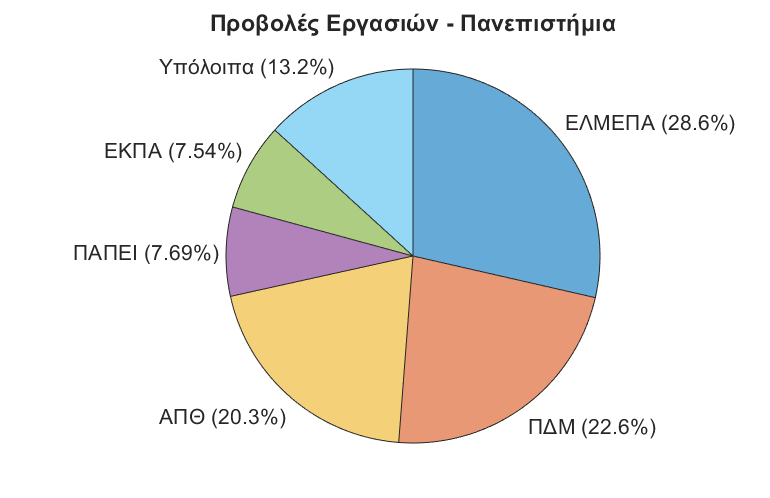 Στα Σχήματα 4 και 5 εμφανίζεται η κατάταξη των Πανεπιστημίων και των Τμημάτων τους αναφορικά με τον αριθμό των προβολών των εργασιών. Σύμφωνα με την κατάταξη των Πανεπιστημίων, στην πρώτη θέση βρίσκεται το Ελληνικό Μεσογειακό Πανεπιστήμιο (ΕΛΜΕΠΑ) με 28.6%, δεύτερο είναι το Πανεπιστήμιο Δυτικής Μακεδονίας (ΠΔΜ) με 22.6% και τρίτο είναι το Αριστοτέλειο Πανεπιστήμιο Θεσσαλονίκης (ΑΠΘ) με 20.3%.