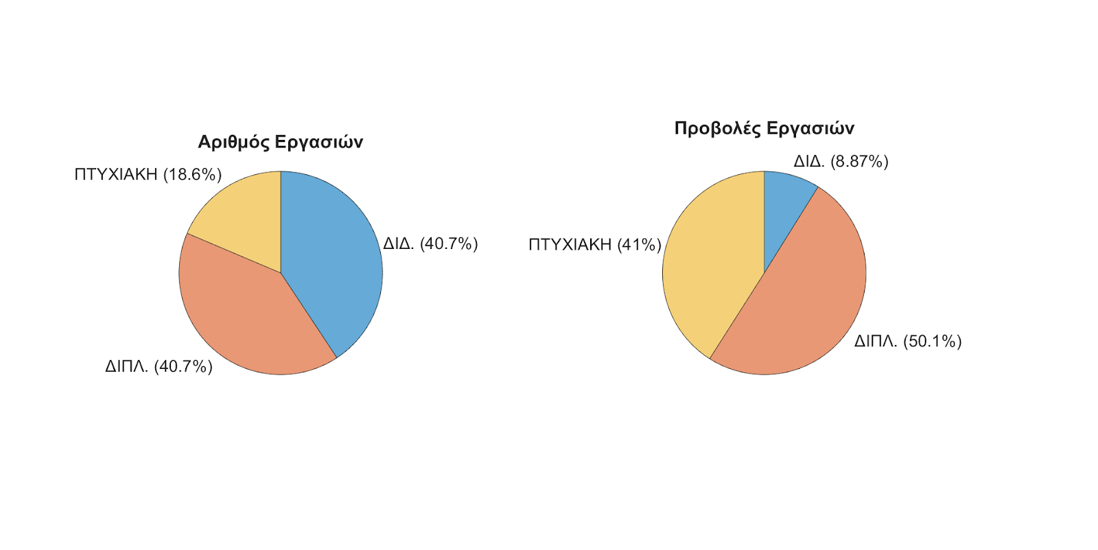 Στο Σχήμα 1 εμφανίζονται τα ποσοστά σε πτυχιακές, διπλωματικές και διδακτορικές διατριβές ως προς τον απόλυτο αριθμό και τις προβολές των εργασιών. Ενδιαφέρον παρουσιάζει το γεγονός πως παρόλο που οι πτυχιακές εργασίες ήταν μόλις το 18.6% του συνόλου, συγκέντρωσαν το 41% των προβολών στο YouTube, έχοντας κατά μέσο όρο περίπου 5000 προβολές ανά εργασία. Οι διπλωματικές εργασίες συγκέντρωσαν περίπου 2800 προβολές ανά εργασία και οι διδακτορικές διατριβές περίπου 500 προβολές ανά εργασία. Φαίνεται να ισχύει πως επειδή τα θέματα που μελετούν οι πτυχιακές εργασίες είναι πιο προσιτά στο ευρύ κοινό συγκεντρώνουν γενικά μεγαλύτερο πλήθος προβολών, το οποίο μειώνεται όσο πιο εξειδικευμένο είναι το θέμα σε μεταπτυχιακό και διδακτορικό επίπεδο.