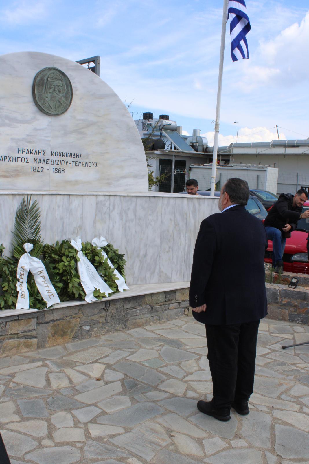 Ο Δήμαρχος Μινώα Πεδιάδας Βασίλης Κεγκέρογλου, ο Πρόεδρος του Δημοτικού Συμβουλίου Μινώα Πεδιάδας Γιώργος Καλογεράκης και ο Πρόεδρος Μικρασιατών και Φίλων Καρδουλιανού Σταύρος Μπιτζαράκης, κατέθεσαν στεφάνι στη μνήμη του οπλαρχηγού Ηρακλή Κοκκινίδη, κατά τη διάρκεια της σεμνής τελετής τιμής και μνήμης που διοργανώθηκε από τον Δήμο Μαλεβιζίου και την Δημοτική Ενότητα Γαζίου, το Σάββατο 5 Απριλίου.