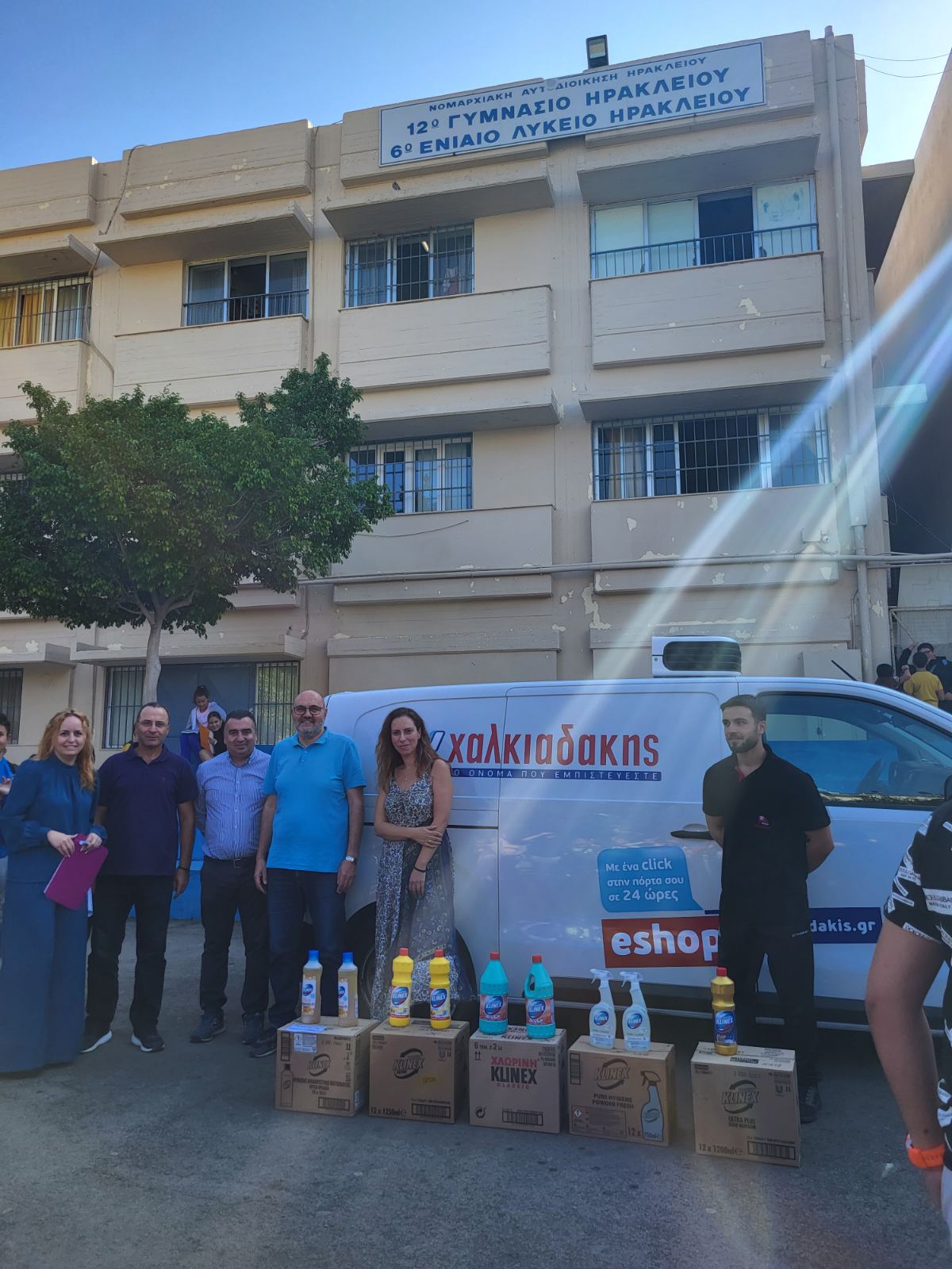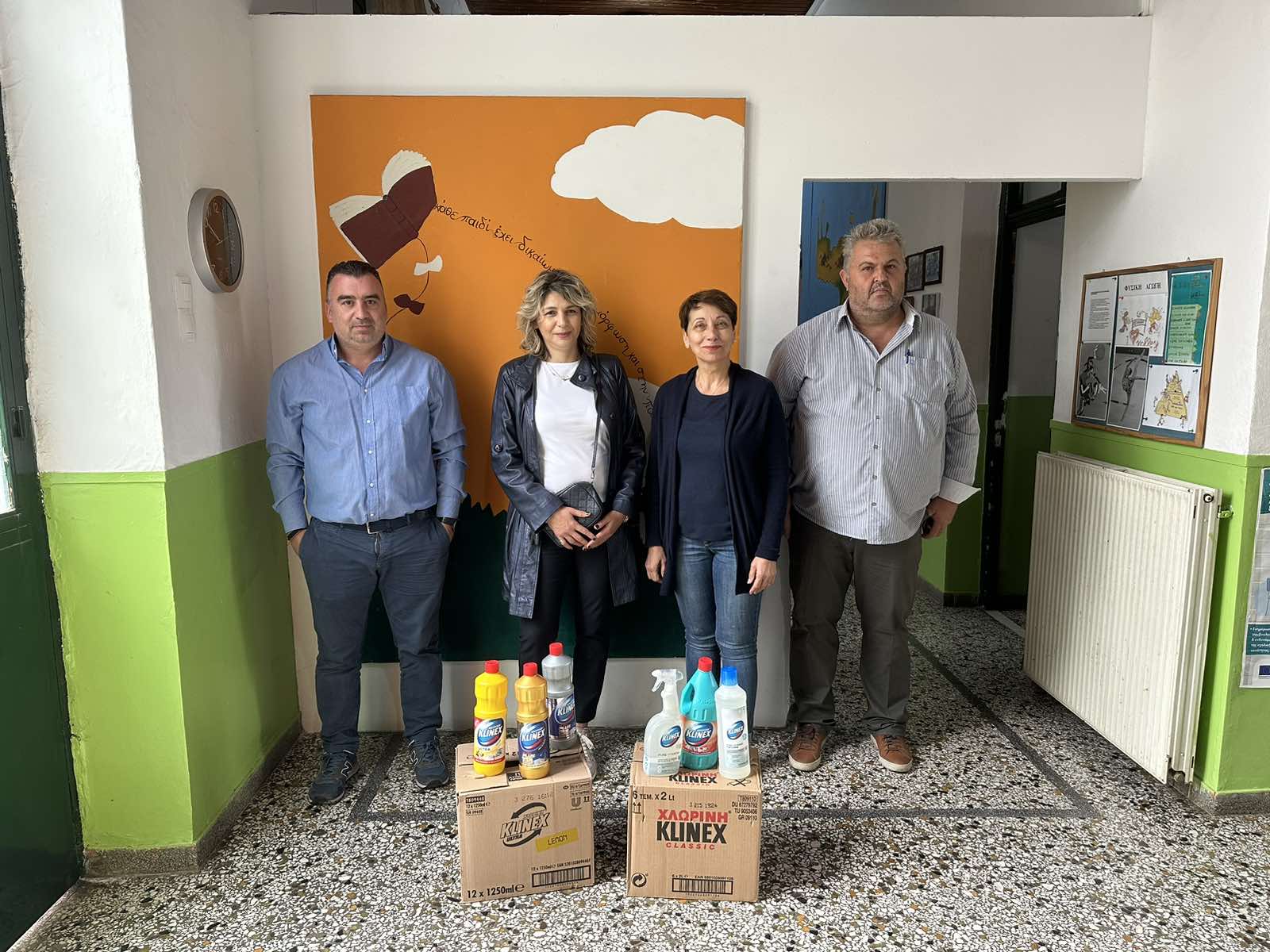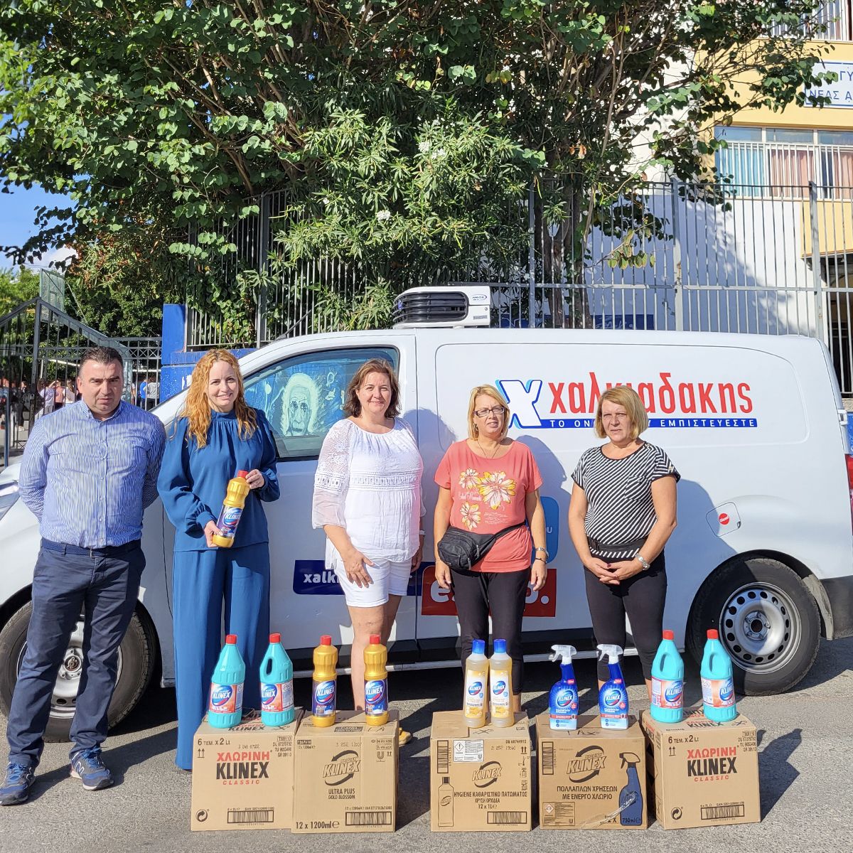Ειδικότερα, έπειτα από πρωτοβουλία των Super Markets Χαλκιαδάκης, παραδόθηκαν στους υπευθύνους των σχολείων καθαριστικά Klinex (χλωρίνες, πολυκαθαριστικά, υγρά πατώματος και επιφανειών), τα οποία θα καλύψουν τις άμεσες ανάγκες των σχολείων. Τα προϊόντα παρέλαβαν από τον εκπρόσωπο της Ελαϊς- Unilever κ. Κώστα Ρουμπάκη και την εκπρόσωπο της Χαλκιαδάκη Α.Ε. κ. Βιβή Ξυπάκη οι Δ/ντες των σχολείων σε: