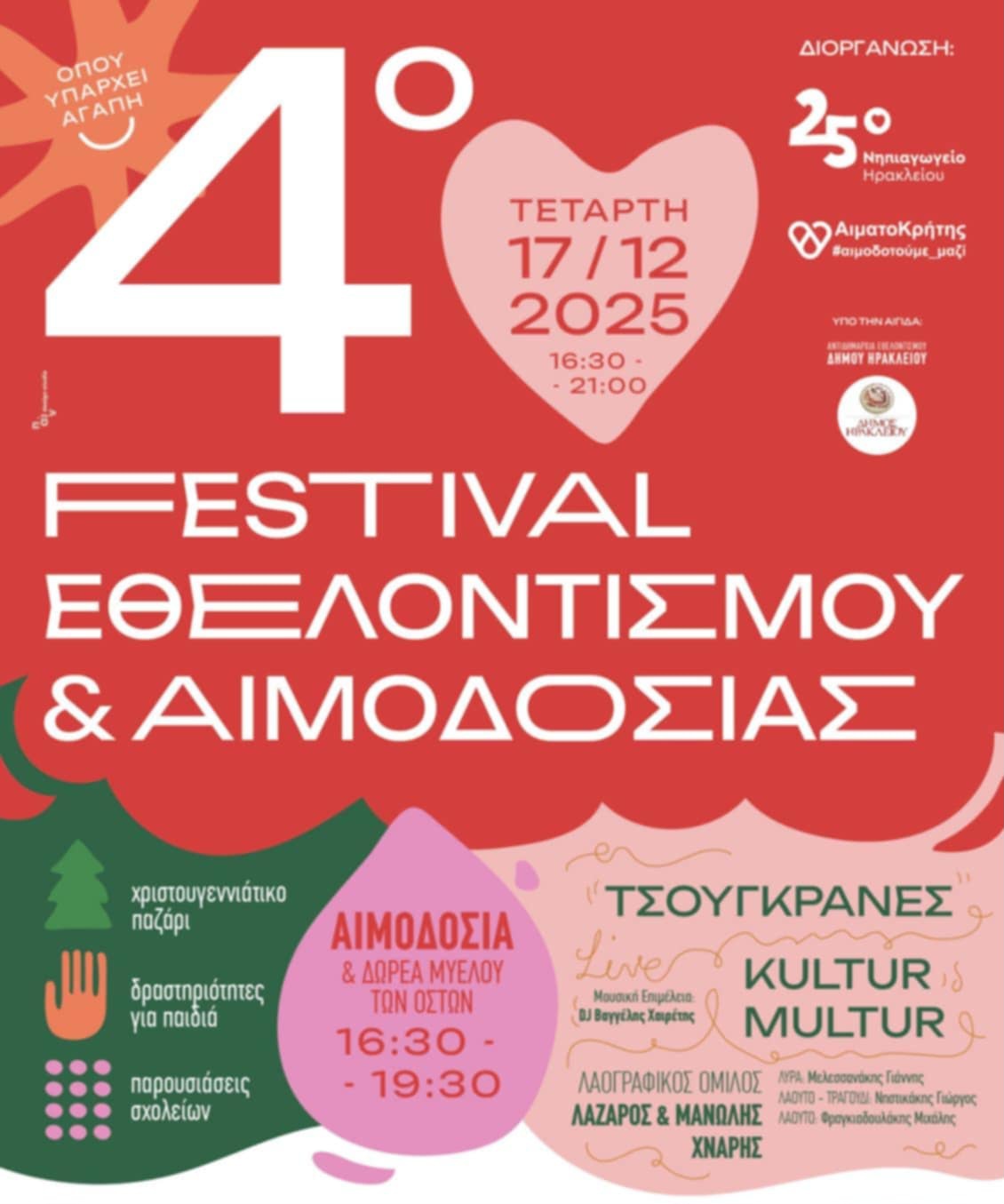 Το 4ο Φεστιβάλ Εθελοντισμού & Αιμοδοσίας, διοργανώνουν την Τετάρτη 17/12, η Αντιδημαρχία Εθελοντισμού του Δήμου Ηρακλείου και το 25ο Νηπιαγωγείο Ηρακλείου σε συνεργασία με τον «Αιματοκρίτη». Η εκδήλωση θα πραγματοποιηθεί από τις 16:30 το απόγευμα έως τις 21:00 το βράδυ, στο 25ο Νηπιαγωγείο στην οδό Ρολέν 2. Πρόκειται για μια μεγάλη, ανοιχτή γιορτή για την προσφορά, τη συνεργασία και την τοπική κοινωνία, με ελεύθερη συμμετοχή.